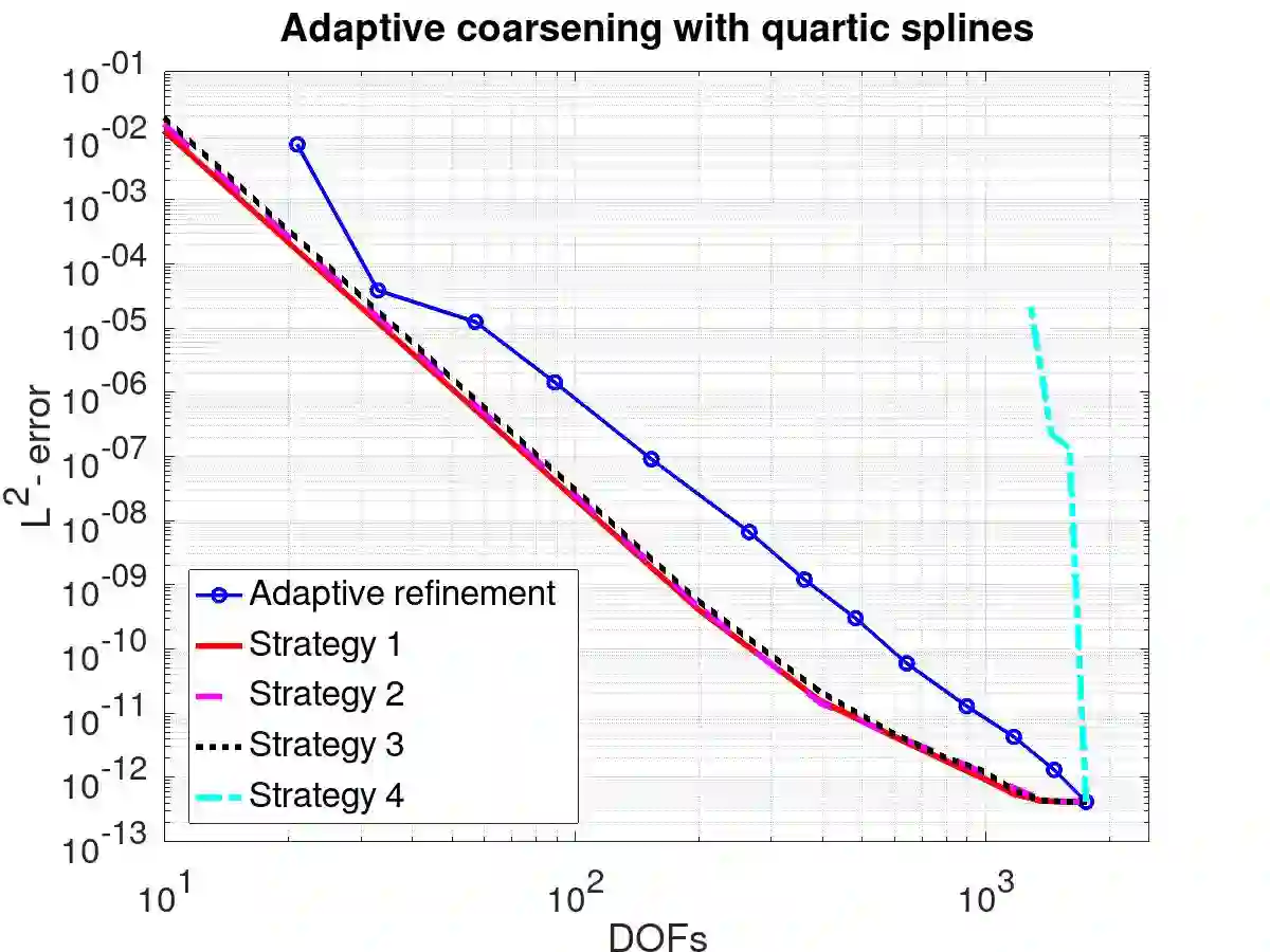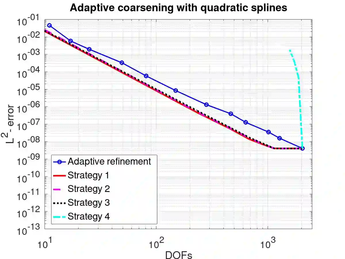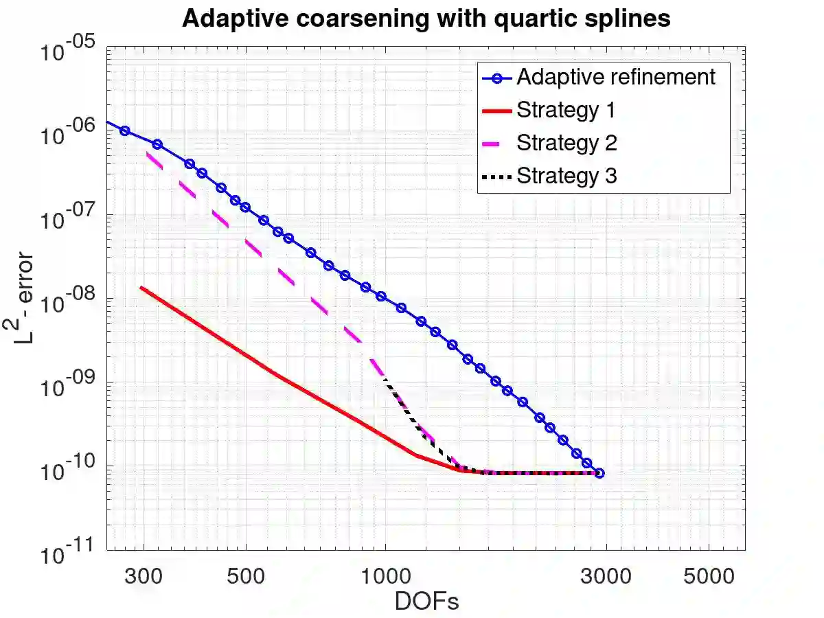 In this article we analyze the error produced by the removal of an arbitrary knot from a spline function. When a knot has multiplicity greater than one, this implies a reduction of its multiplicity by one unit. In particular, we deduce a very simple formula to compute the error in terms of some neighboring knots and a few control points of the considered spline. Furthermore, we show precisely how this error is related to the jump of a derivative of the spline at the knot. We then use the developed theory to propose efficient and very low-cost local error indicators and adaptive coarsening algorithms. Finally, we present some numerical experiments to illustrate their performance and show some applications.