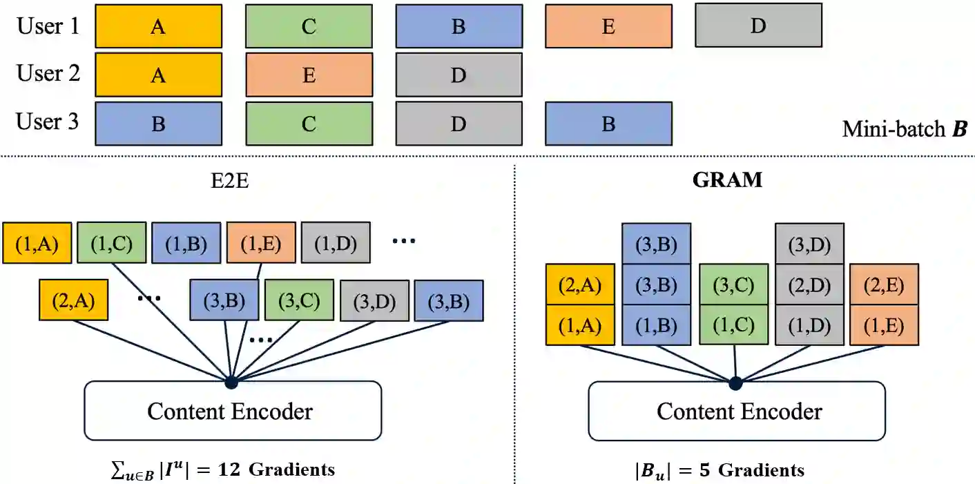翻译:基于内容的协作过滤(CCF)根据用户的互动历史和项目内容信息提供个性化项目建议。最近,使用预先培训的语言模型(PLM)为CCF提取高质量的项目编码。然而,由于CCF的多模式性质,以端到端方式微调PLM(E2E)需要大量资源:优化涉及用户互动的冗余内容编码。为此,我们提议GRAM(多式组合组合组合):(1)单步GRAM,将每个项目的梯度加在一起,同时保持与E2E的理论等同;(2)多步GRAM,在多个培训步骤中进一步积累梯度,而E2E的GPU记忆足迹不到40 ⁇ GPU。我们从经验上确认,GRAM在从知识追踪和新闻建议两个任务领域(即单步和多步GRAM平均达到4x和45x培训速度)的五个数据集的基础上,在培训效率上取得了显著的提高。