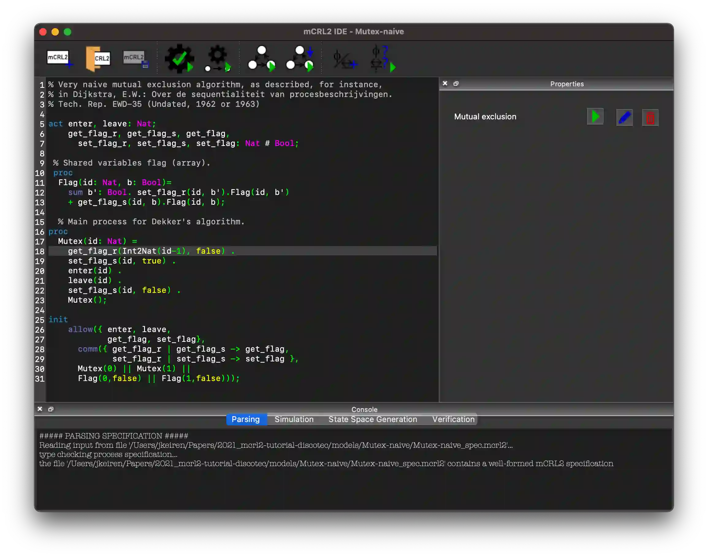 Distributed software is very tricky to implement correctly as some errors only occur in peculiar situations. For such errors testing is not effective. Mathematically proving correctness is hard and time consuming, and therefore, it is rarely done. Fortunately, there is a technique in between, namely model checking, that, if applied with skill, is both efficient and able to find rare errors. In this tutorial we show how to create behavioural models of parallel software, how to specify requirements using modal formulas, and how to verify these. For that we use the mCRL2 language and toolset (https://www.mcrl2.org/). We discuss the design of an evolution of well-known mutual exclusion protocols, and how model checking not only provides insight in their behaviour and correctness, but also guides their design.