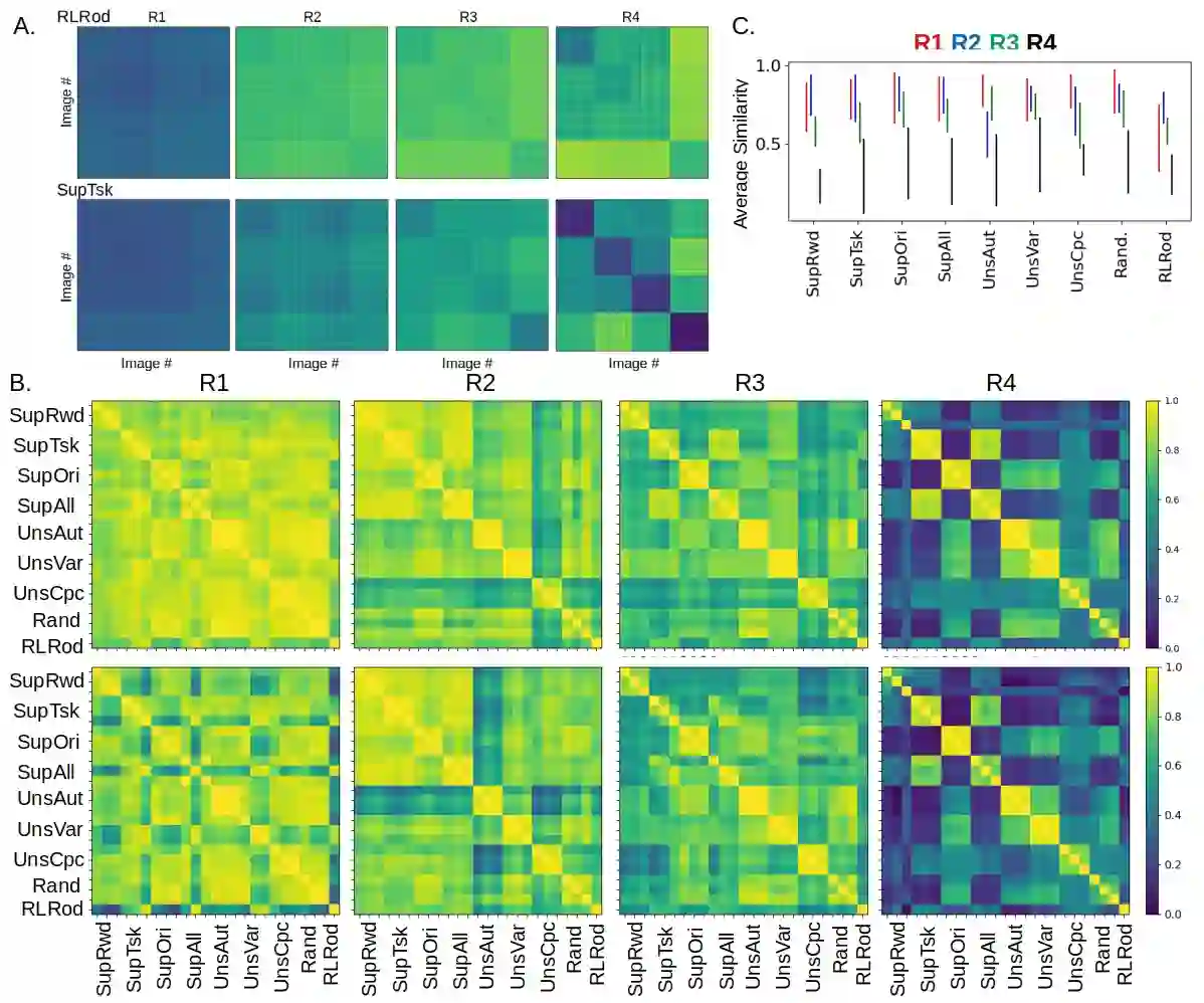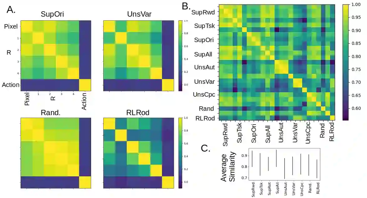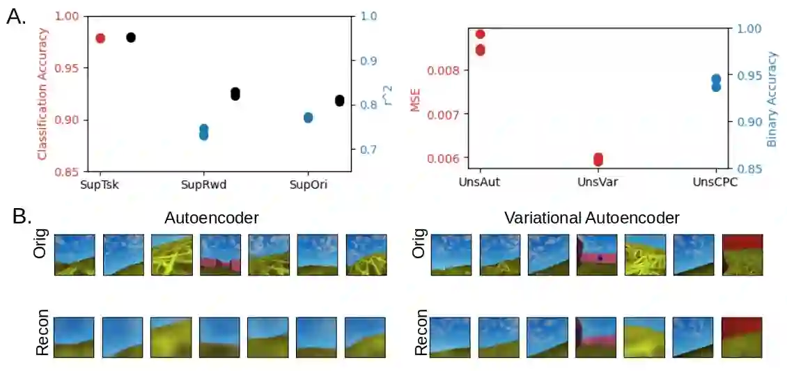 翻译:利用强化、监督和不受监督的学习,经过培训的人工神经系统都获得高维投入的内部表现。 这些表现在多大程度上取决于不同的学习目标,基本上不为人所知。 在这里,我们比较了八个不同的进化神经网络所学的表述,每个网络都具有相同的ResNet结构,并受过相同的自我中心图像家庭的培训,但都嵌入不同的学习系统。具体地说,这些表述经过培训,以指导复合强化学习任务的行动;预测一个或三个任务相关目标与监督的组合;或使用三个不同但不受监督的目标之一。使用代表性相似性分析,我们发现受过强化学习培训的网络与其他网络相比差别最大。我们利用神经科学文献所启发的衡量标准,我们发现受过强化学习培训的模型具有稀疏和高维度的表述,其中个人图像具有非常不同的神经活动模式。进一步分析表明,这些表述可能出现于指导长期行为和在RL代理中追求目标。最后,我们比较了RL代理所学到的演示,从鼠视内特质活动中获得的神经活动,我们通过客观的思维方式可以更好地了解我们的视觉表现。