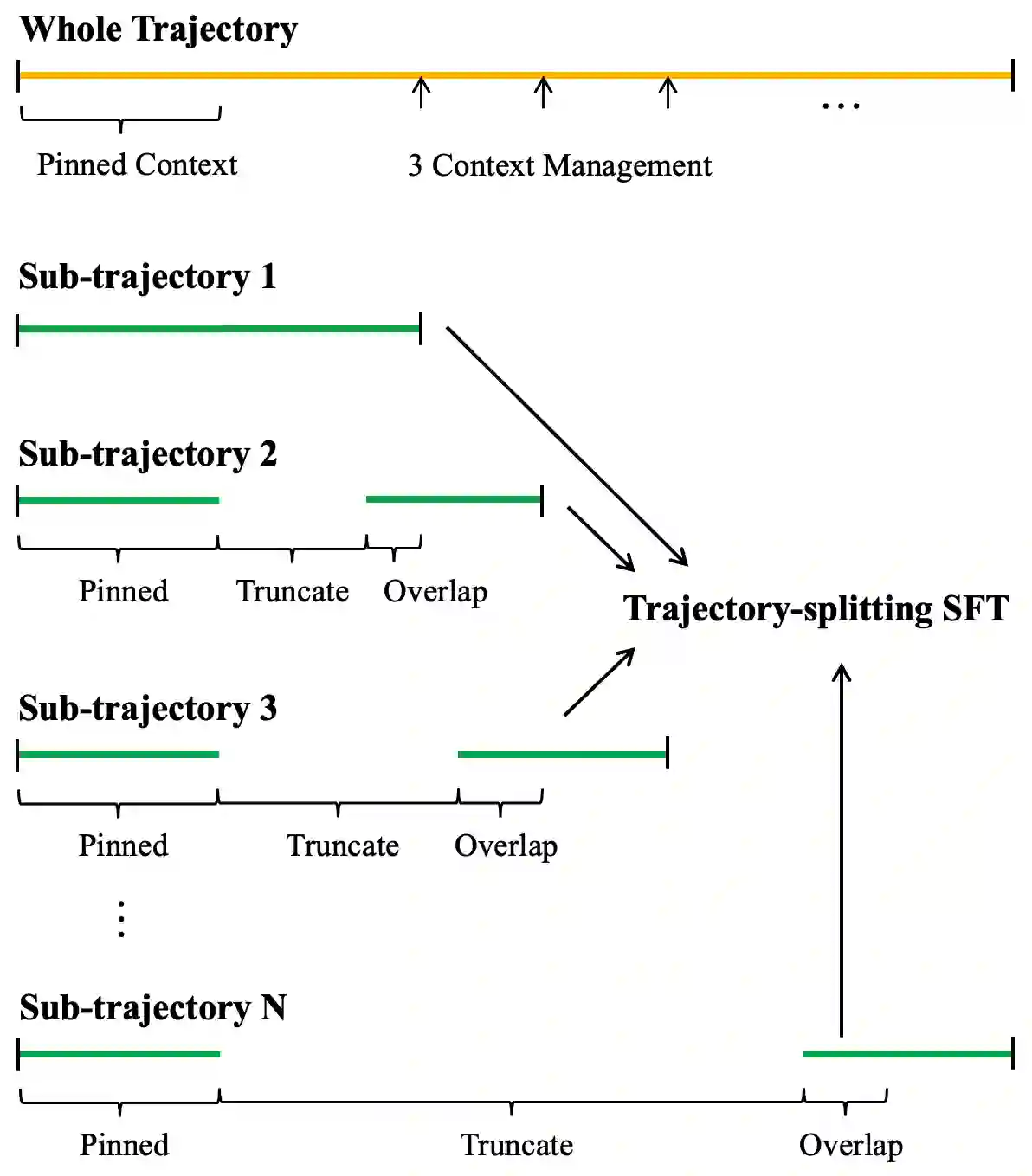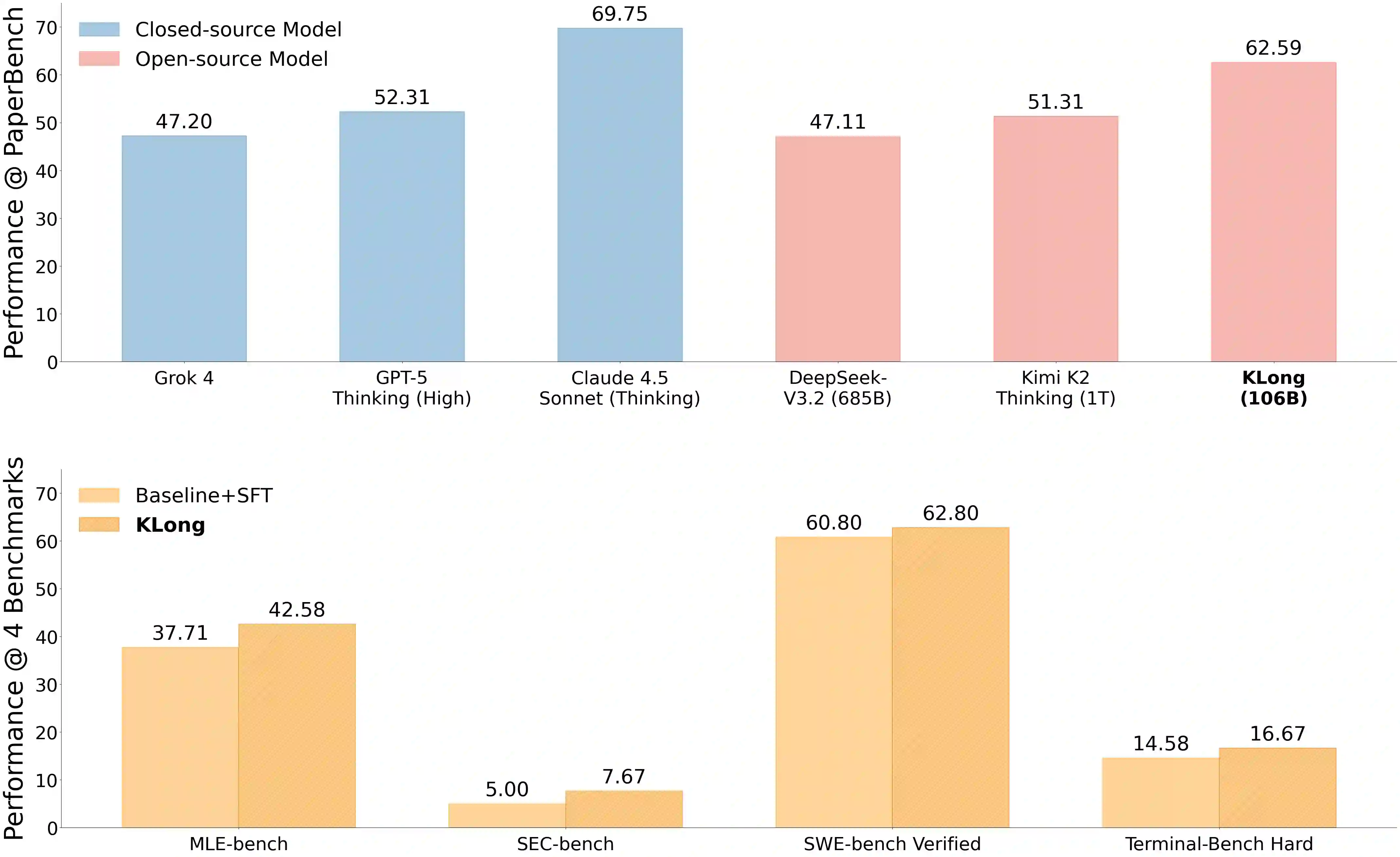 翻译:本文介绍KLong,一种用于解决超长程任务的开源LLM智能体。其核心原理是首先通过轨迹分割监督微调实现冷启动,随后通过渐进式强化学习进行规模化训练。具体而言,我们首先通过综合性的监督微调方案激活基础模型的基础智能体能力。随后,我们引入Research-Factory——一个通过收集研究论文并构建评估准则来自动生成高质量训练数据的流水线。利用该流水线,我们从Claude 4.5 Sonnet(思考版)中蒸馏构建了数千条长程轨迹。为处理这些超长轨迹的训练,我们提出了一种新的轨迹分割监督微调方法,该方法保留早期上下文,逐步截断后续上下文,并保持子轨迹间的重叠部分。此外,为进一步提升长程任务解决能力,我们提出了一种新颖的渐进式强化学习方法,该方法将训练规划为多个阶段,并逐步延长超时阈值。实验证明了KLong的优越性与泛化能力,如图1所示。值得注意的是,我们提出的KLong(106B)在PaperBench上以11.28%的优势超越Kimi K2 Thinking(1T),且性能提升可泛化至SWE-bench Verified和MLE-bench等其他代码评测基准。