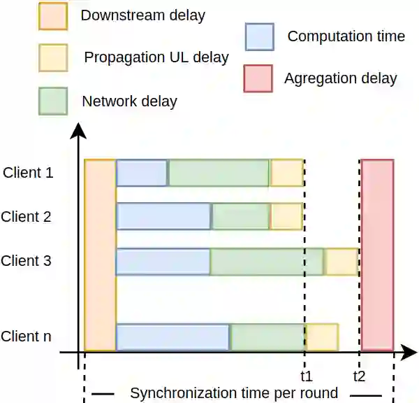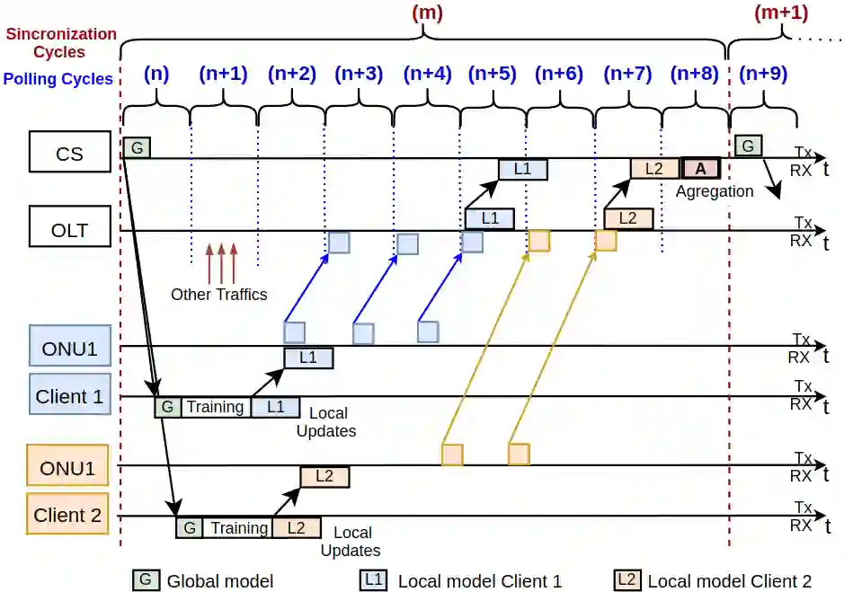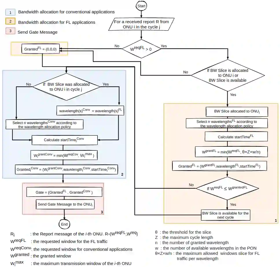 翻译:联邦学习(FL)是一种分布式机器学习(ML)处理方式,它保护用户数据的隐私,只与共用服务器共享ML模型的参数;FL的处理需要通信网络运作需要满足的具体的延时和带宽要求;本文介绍了用于服务质量的动态波长和带宽分配算法(Qos),为FL传输量超过50Gb/s Ethernet被动光学网络提供50Gb/s Ethernet被动光学网络;拟议的算法优先考虑FL通信量,减少FL的延迟,减少在同一基础设施支持的延迟关键应用。