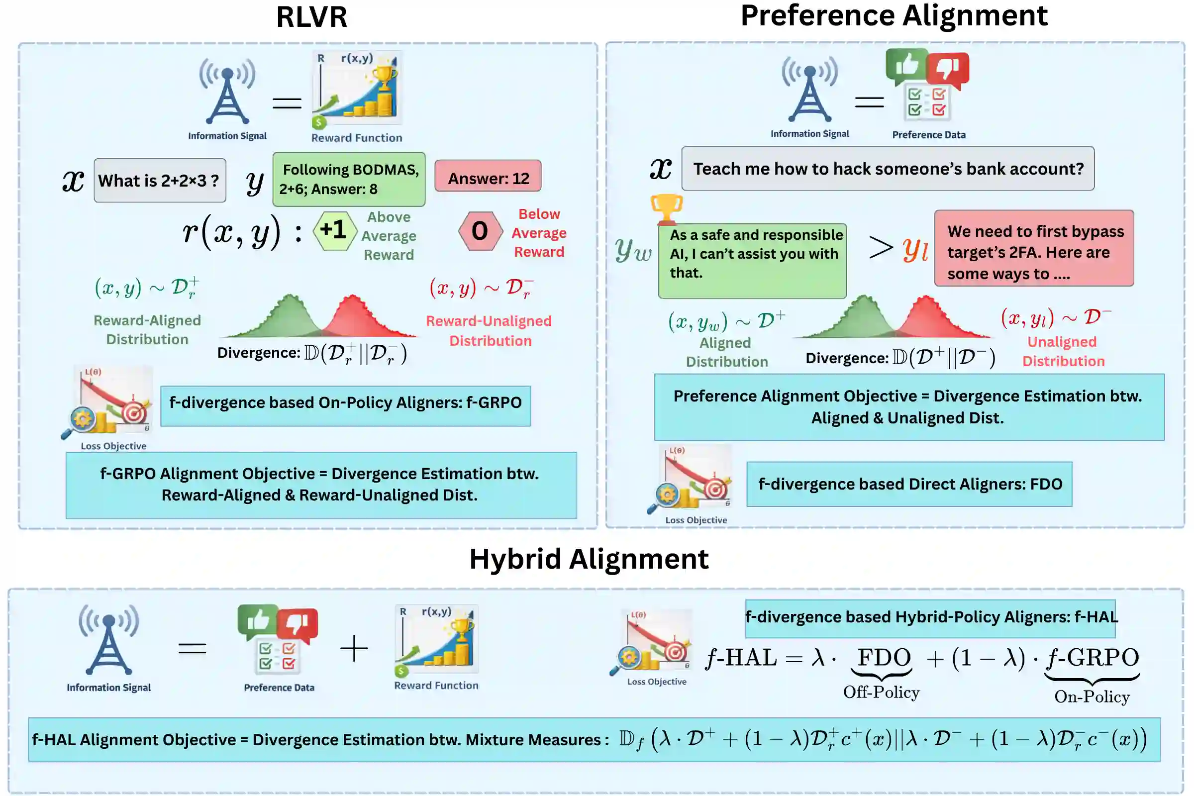 翻译:近期研究表明,偏好对齐目标可视为对齐(被选)与未对齐(被拒)响应分布间的散度估计量。本工作将这一基于散度的视角扩展至通用对齐场景,例如仅依赖环境奖励的强化学习。在此统一框架下,我们基于$f$-散度的变分表示,提出了用于通用大语言模型对齐的$f$-分组相对策略优化(一类在线策略强化学习算法)与$f$-混合对齐损失(混合在线/离线策略目标)。我们提供了理论保证,证明这些目标类能在对齐后提升平均奖励。通过实验,我们在强化学习任务与偏好对齐任务上验证了该框架,相较于现有方法展现出更优的性能与灵活性。