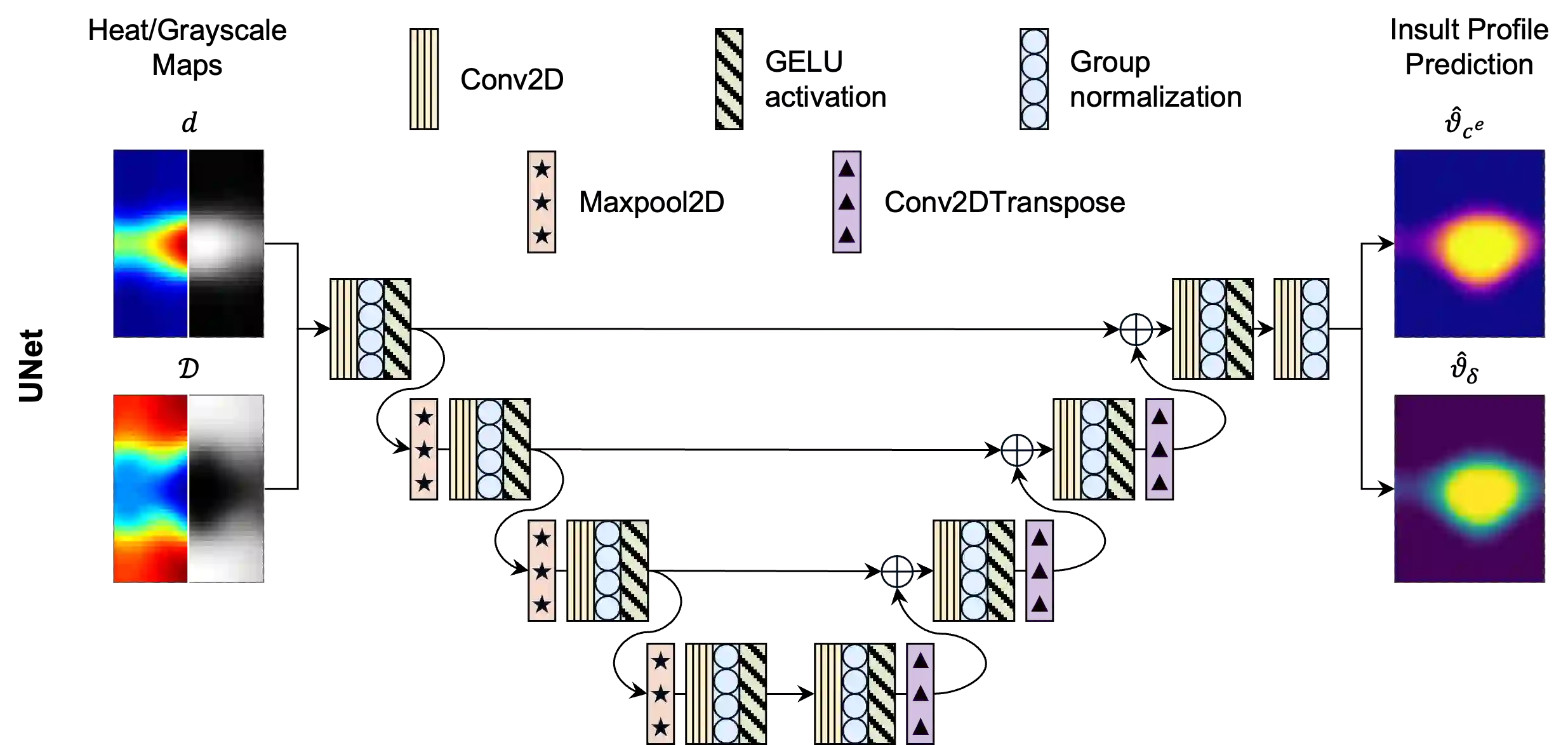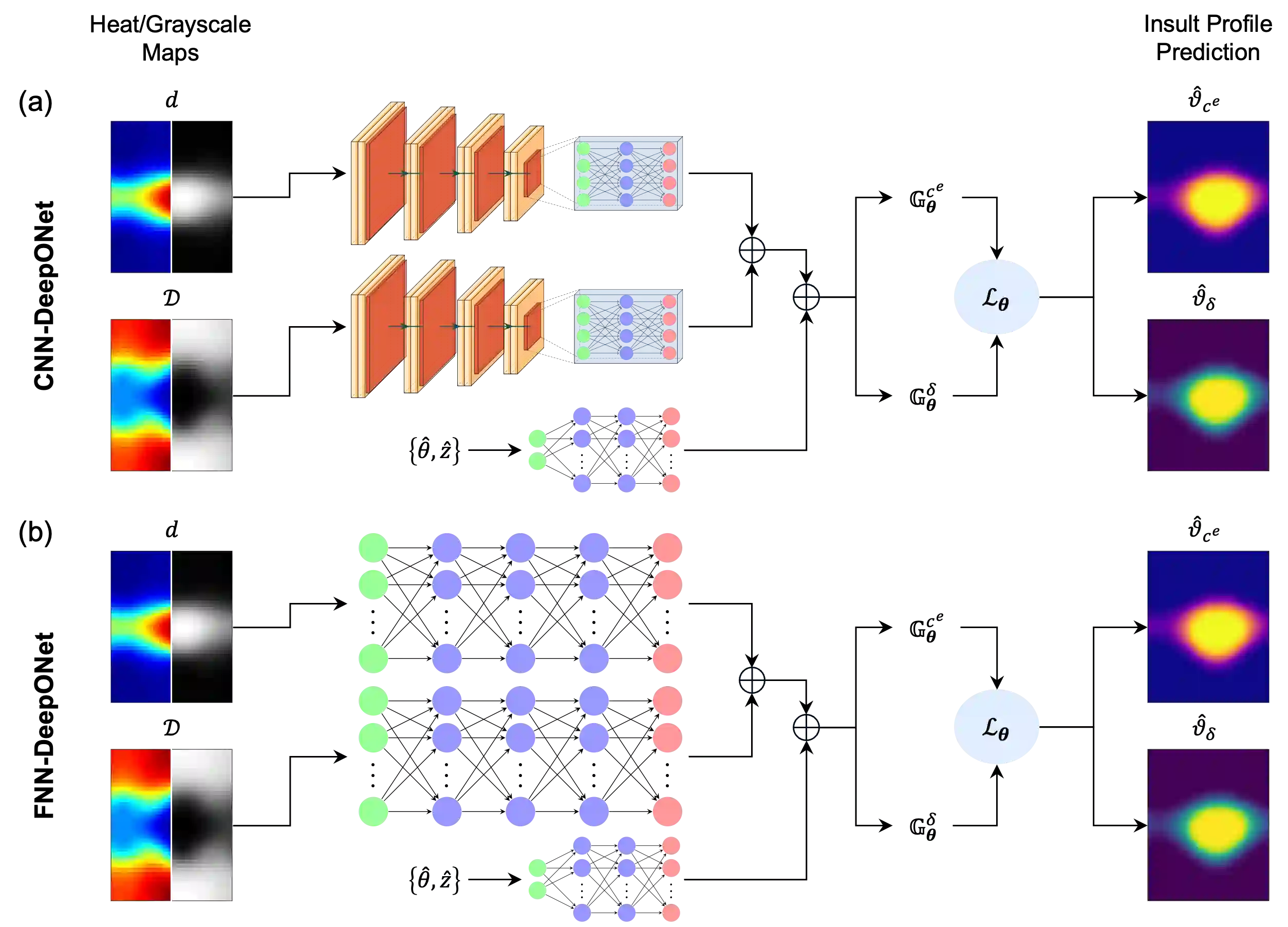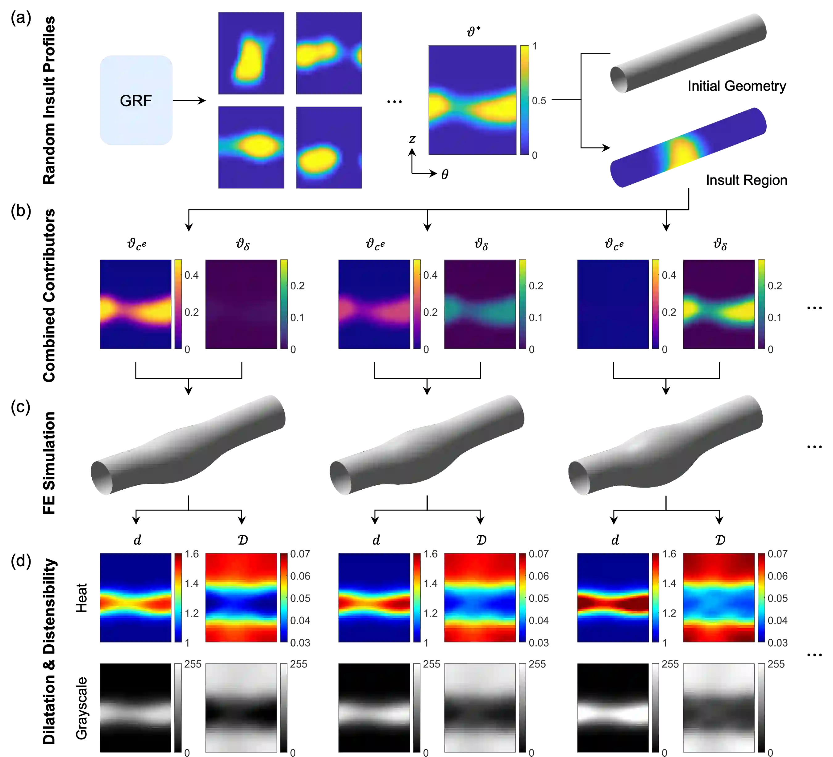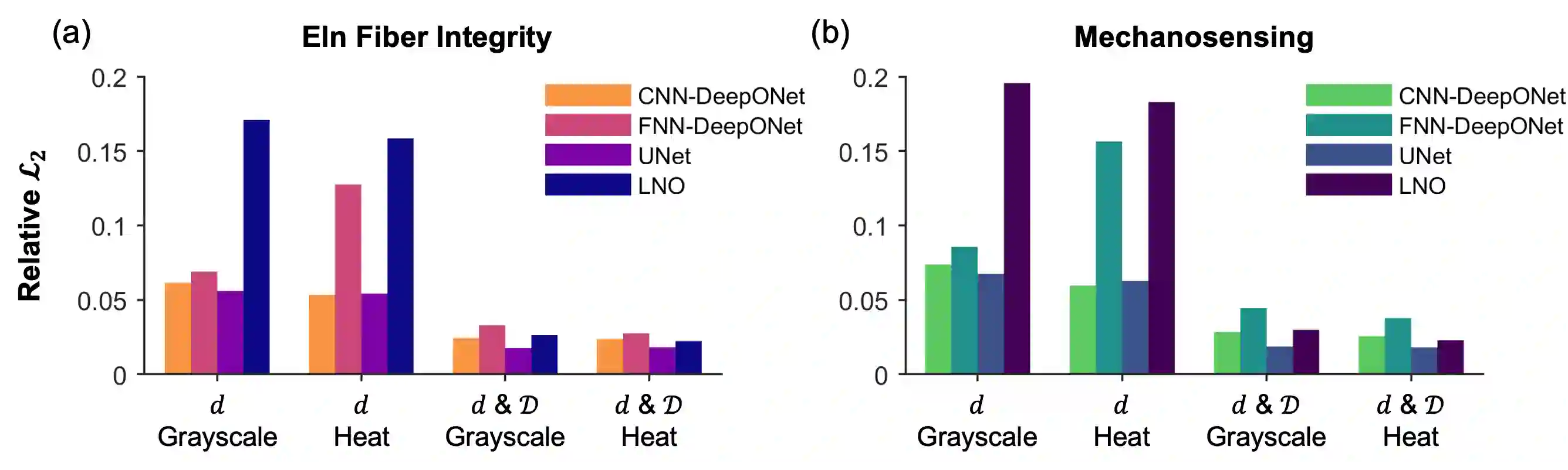 翻译:胸主动脉瘤(TAAs)源于主动脉壁多种机械及力学生物学紊乱,这些紊乱增加了夹层或破裂的风险。有证据表明TAA的发生与主动脉力传导轴功能障碍相关,包括弹性纤维完整性丧失和细胞-基质连接破坏。由于不同的损伤会造成不同的机械脆弱性,因此亟需识别驱动疾病进展的相互作用因素。本文采用有限元框架,通过数百种涵盖不同程度弹性纤维损伤和机械感受功能受损的异质性损伤,生成合成TAA模型。基于这些模拟数据,我们构建了局部扩张性与可扩张性的空间分布图,用以训练预测初始复合损伤的神经网络。我们比较了多种架构(Deep Operator Networks、UNets和Laplace Neural Operators)及多类输入数据格式,旨在为未来个体特异性建模建立标准。同时,我们量化了网络仅使用几何数据(扩张性)与联合使用几何和机械数据(扩张性加可扩张性)时的预测性能。在所有网络中,仅使用扩张性数据训练时预测误差显著更高,凸显了可扩张性信息的附加价值。在测试模型中,UNet在所有数据格式下均保持最高预测精度。这些发现强调了在TAA评估中获取扩张性与可扩张性全场测量数据的重要性,这有助于揭示疾病的力学生物学驱动机制,并为个性化治疗策略的制定提供支持。