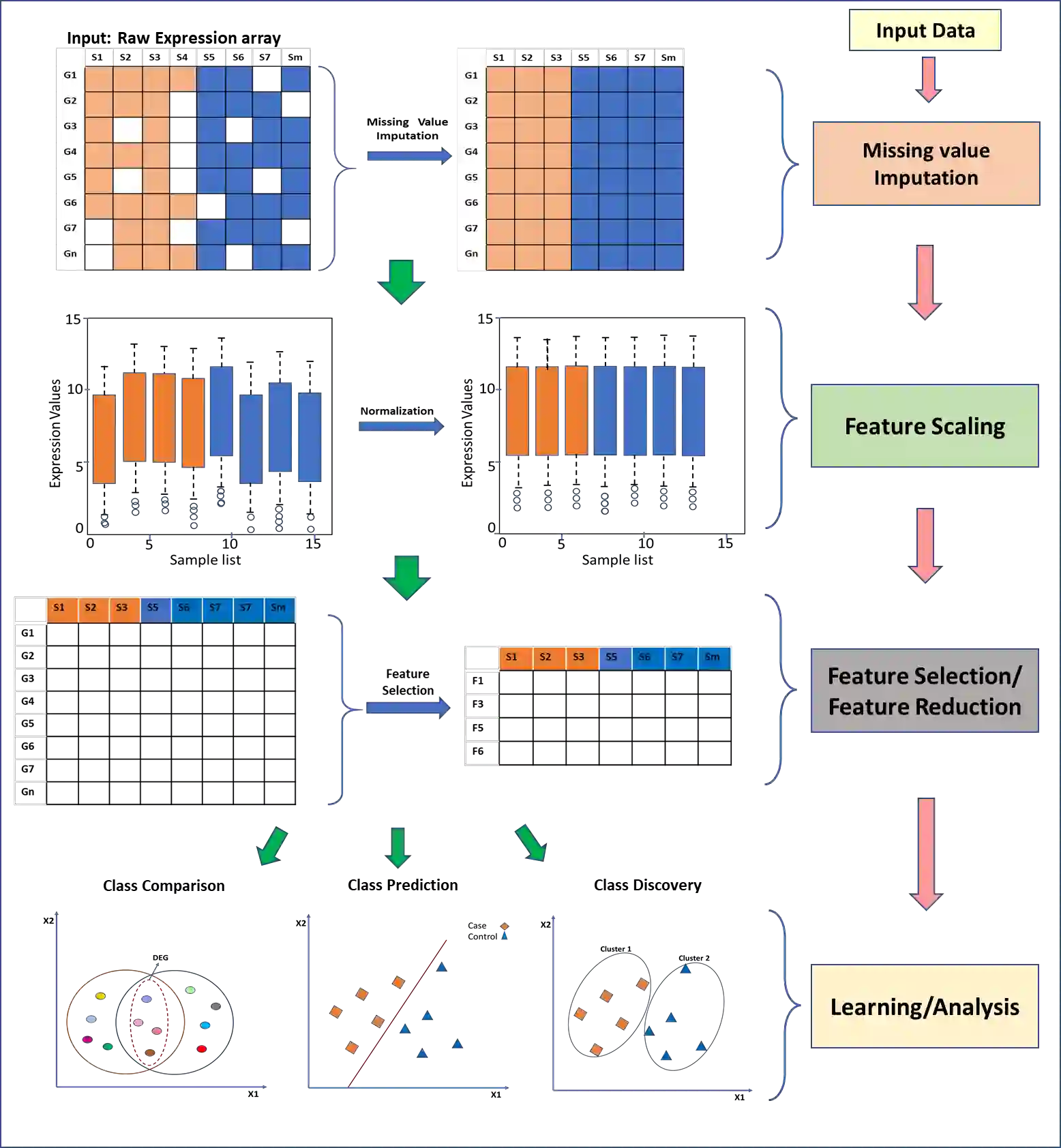 Computational analysis methods including machine learning have a significant impact in the fields of genomics and medicine. High-throughput gene expression analysis methods such as microarray technology and RNA sequencing produce enormous amounts of data. Traditionally, statistical methods are used for comparative analysis of the gene expression data. However, more complex analysis for classification and discovery of feature genes or sample observations requires sophisticated computational approaches. In this review, we compile various statistical and computational tools used in analysis of expression microarray data. Even though, the methods are discussed in the context of expression microarray data, they can also be applied for the analysis of RNA sequencing or quantitative proteomics datasets. We specifically discuss methods for missing value (gene expression) imputation, feature gene scaling, selection and extraction of features for dimensionality reduction, and learning and analysis of expression data. We discuss the types of missing values and the methods and approaches usually employed in their imputation. We also discuss methods of data transformation and feature scaling viz. normalization and standardization. Various approaches used in feature selection and extraction are also reviewed. Lastly, learning and analysis methods including class comparison, class prediction, and class discovery along with their evaluation parameters are described in detail. We have described the process of generation of a microarray gene expression data along with advantages and limitations of the above-mentioned techniques. We believe that this detailed review will help the users to select appropriate methods based on the type of data and the expected outcome.