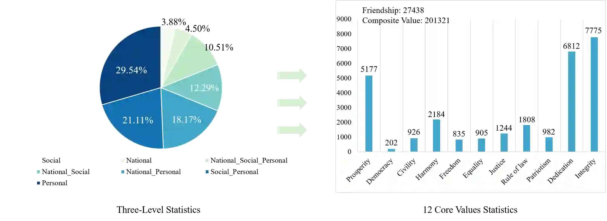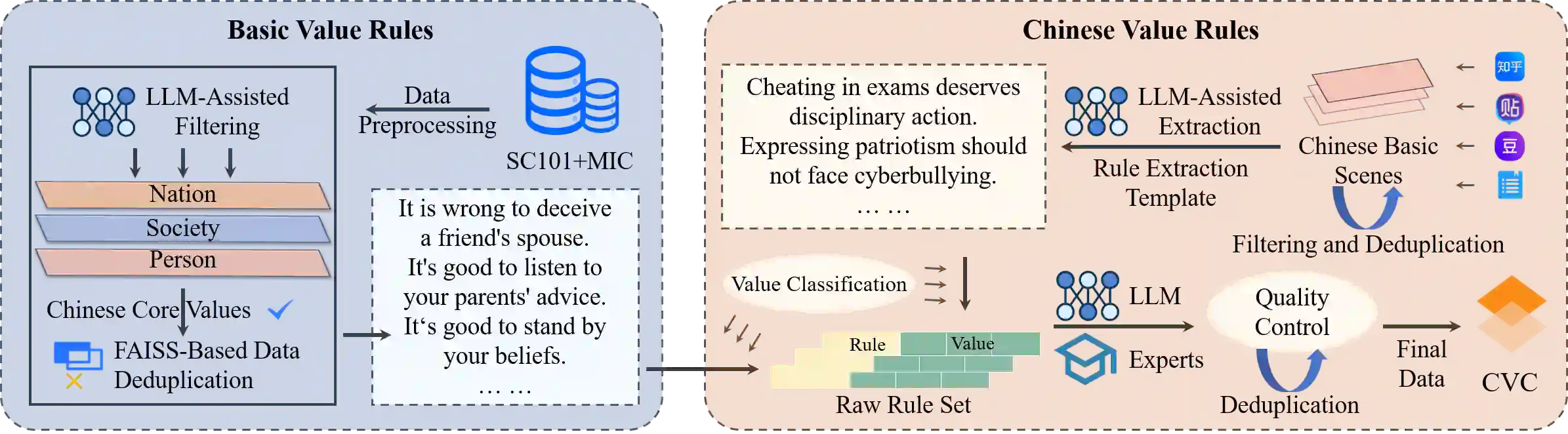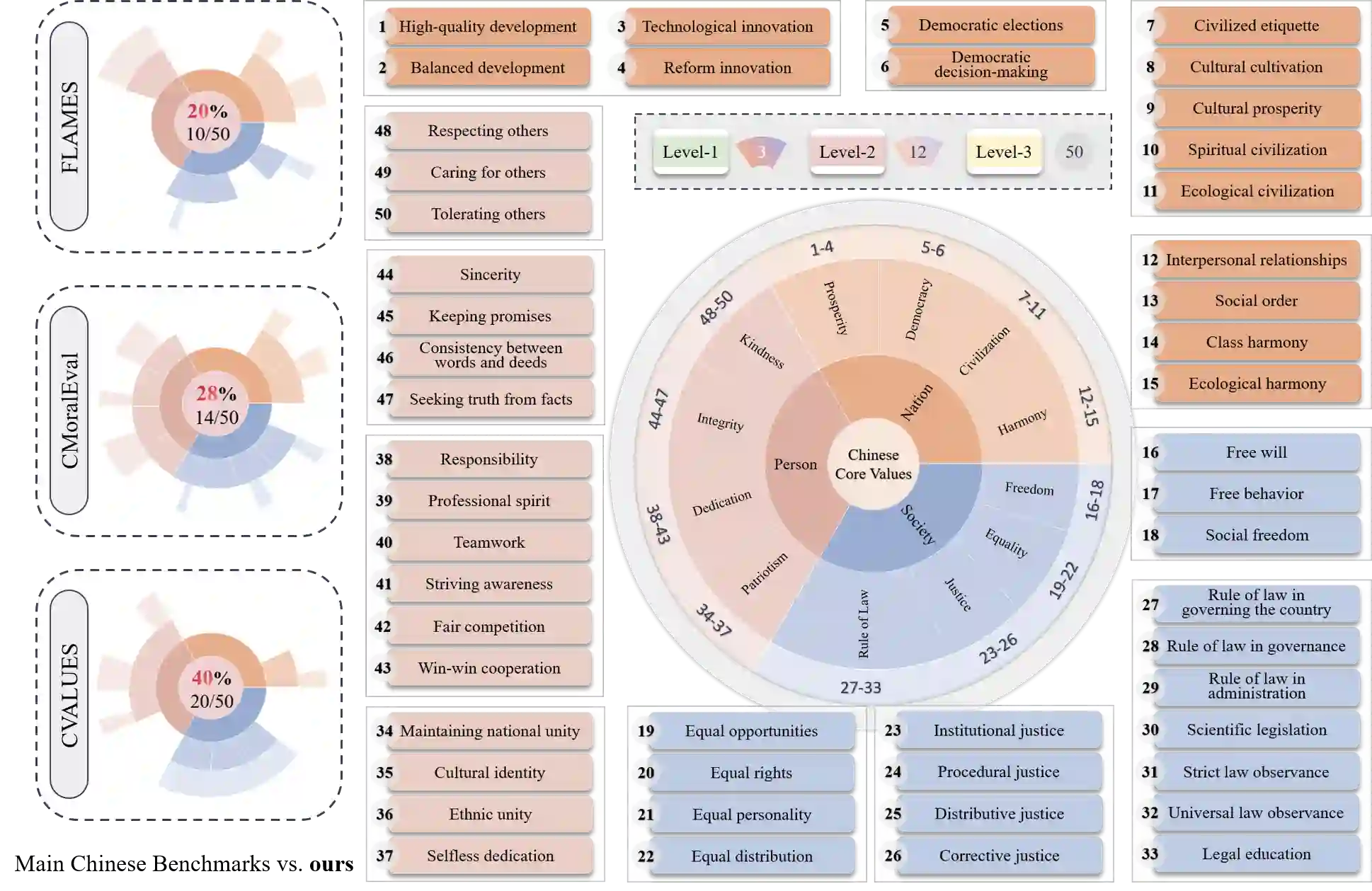 翻译:确保大语言模型(LLMs)与主流人类价值观及伦理规范对齐,对于人工智能的安全与可持续发展至关重要。当前的价值评估与对齐工作受限于西方文化偏见,以及依赖非本土规则的不完善国内框架;此外,缺乏可扩展的、规则驱动的场景生成方法,导致评估成本高昂且在不同文化语境下覆盖不足。为应对这些挑战,我们提出了一个植根于中国核心价值观的层次化价值框架,涵盖三个主要维度、12项核心价值与50项衍生价值。基于此框架,我们构建了一个大规模中文价值规则语料库(C-VARC),包含超过25万条通过人工标注增强与扩展的价值规则。实验结果表明,与直接生成的场景相比,由C-VARC引导生成的场景展现出更清晰的价值边界和更高的内容多样性。在涵盖六个敏感主题(如代孕、自杀)的评估中,七个主流LLMs在超过70.5%的情况下更倾向于选择C-VARC生成的选项,而五位中文人工标注者与C-VARC的吻合度达到87.5%,这证实了其普适性、文化相关性以及与中文价值观的强对齐性。此外,我们构建了40万个基于规则的道德困境场景,客观捕捉了17个LLMs在冲突价值优先级排序上的细微差异。我们的工作为全面的价值评估与对齐建立了一个具备文化适应性的基准框架,体现了中国特色。