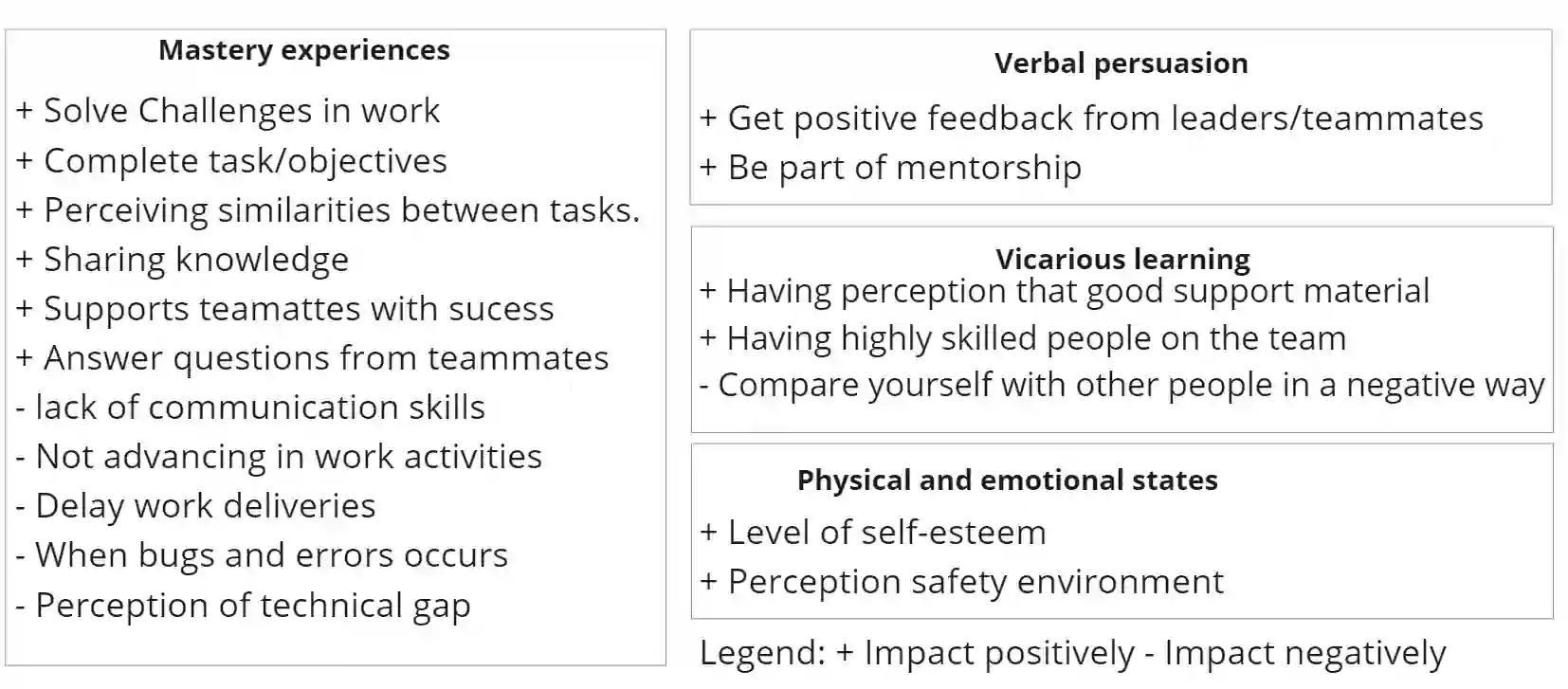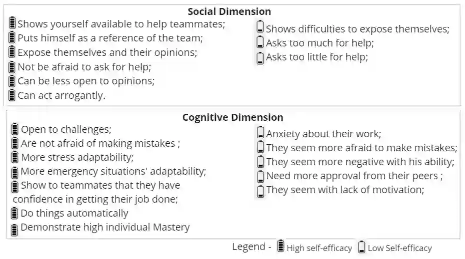 CONTEXT: Self-efficacy is a concept researched in various areas of knowledge that impacts various factors such as performance, satisfaction, and motivation. In Software Engineering, it has mainly been studied in the academic context, presenting results similar to other areas of knowledge. However, it is also important to understand its impact in the industrial context. OBJECTIVE: Therefore, this study aims to understand the impact on the software development context with a focus on understanding the behavioral signs of self-efficacy in software engineers and how self-efficacy can impact the work-day of software engineers. METHOD: A qualitative research was conducted using semi-structured questionnaires with 31 interviewees from a software development company located in Brazil. The interviewees participated in a Bootcamp and were later assigned to software development teams. Thematic analysis was used to analyze the data. RESULTS: In the perception of the interviewees, 21 signs were found that are related to people with high and low self-efficacy. These signs were divided into two dimensions: social and cognitive. Also, 18 situations were found that can lead to an increase or decrease of self-efficacy of software engineers. Finally, 12 factors were mentioned that can impact software development teams. CONCLUSION: This work evidences a set of behavioral signs that can help team leaders to better perceive the self-efficacy of their members. It also presents a set of situations that both leaders and individuals can use to improve their self-efficacy in the development context, and finally, factors that can be impacted by self-efficacy in the software development context are also presented. Finally, this work emphasizes the importance of understanding self-efficacy in the industrial context.