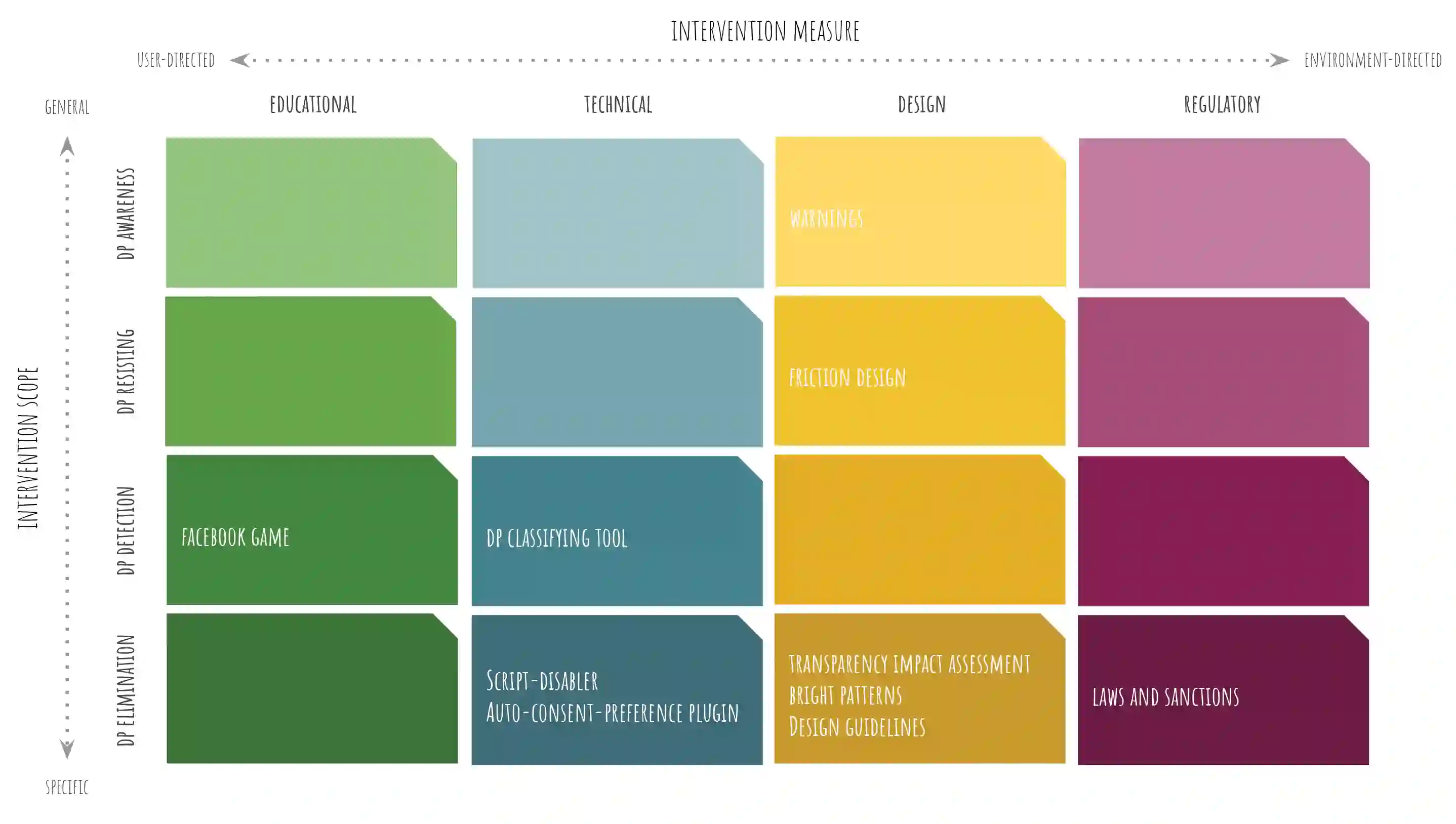 This position paper draws from the complexity of dark patterns to develop arguments for differentiated interventions. We propose a matrix of interventions with a \textit{measure axis} (from user-directed to environment-directed) and a \textit{scope axis} (from general to specific). We furthermore discuss a set of interventions situated in different fields of the intervention spaces. The discussions at the 2021 CHI workshop "What can CHI do about dark patterns?" should help hone the matrix structure and fill its fields with specific intervention proposals.