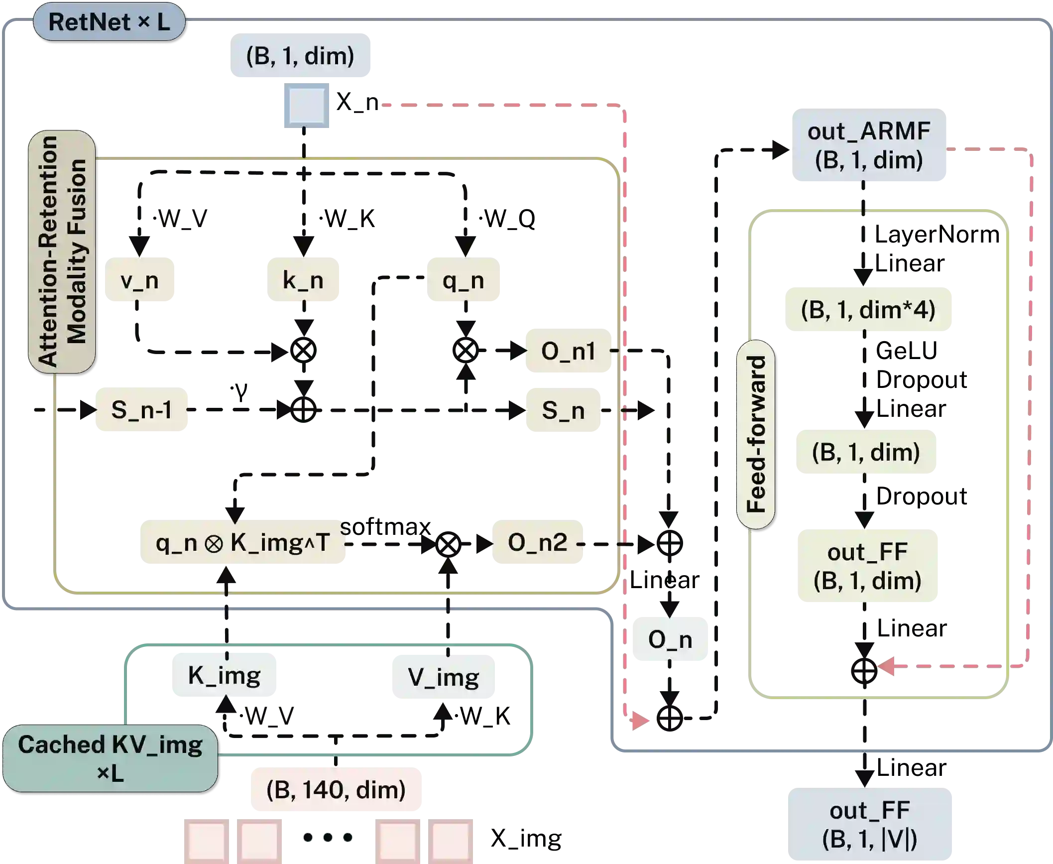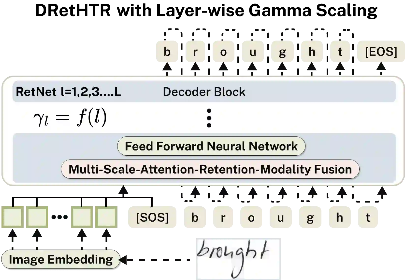 翻译:当前最先进的手写文本识别系统通常使用Transformer模型,但其不断增长的关键值缓存导致解码速度慢且内存占用高。我们提出了DRetHTR,一种基于保留网络构建的仅解码器模型。与同等规模的仅解码器Transformer基线相比,DRetHTR在保持精度不变的情况下,实现了1.6-1.9倍的推理加速,并减少了38-42%的内存使用。通过用无需softmax的保留机制替代softmax注意力,并注入多尺度序列先验,DRetHTR避免了关键值缓存的增长:解码过程在时间和内存上均与输出长度呈线性关系。为了恢复注意力机制从局部到全局的归纳偏置,我们提出了层间伽马缩放策略,该策略在更深层中逐步扩大有效保留范围。这促使浅层建模短程依赖,深层捕获更广泛的上下文,从而缓解因移除softmax而引入的灵活性差距。因此,DRetHTR在多个数据集上取得了目前报道的最佳测试字符错误率:IAM-A(英文)为2.26%,RIMES(法文)为1.81%,Bentham(英文)为3.46%,并在READ-2016(德文)上以4.21%的错误率表现出竞争力。这表明仅解码器的保留网络能够实现Transformer级别的手写文本识别精度,同时显著提升解码速度和内存效率。