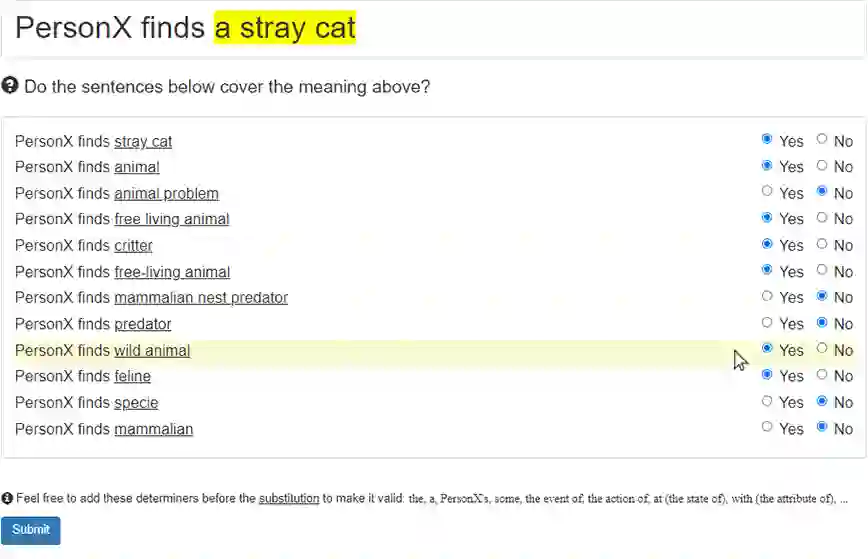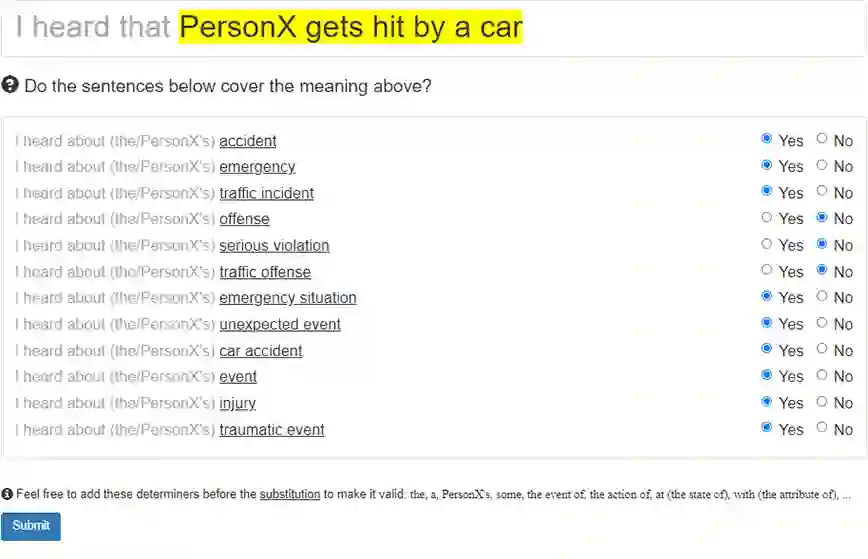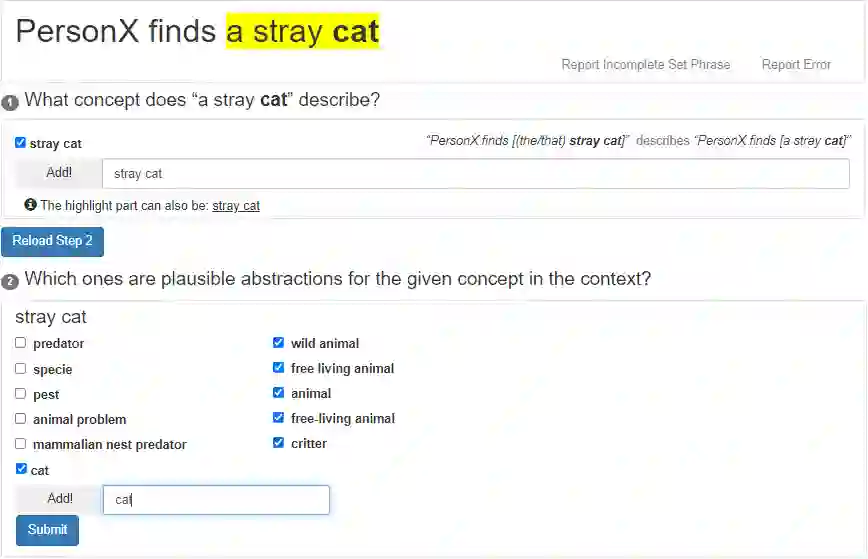 翻译:概念化,或将实体和情况视为抽象概念的事例,在思想中视为抽象概念,并在此基础上作出推论,是人类情报中一个至关重要的组成部分,以进行常识推理。虽然最近的人工情报在获取和模拟常识方面取得了进展,这是大型神经语言模型和常识知识图(CKGs)所推算的,但概念化还有待彻底引入,使目前的做法无法有效地涵盖对现实世界无数不同实体和情况的认知。为了解决这个问题,我们彻底研究概念化在常识推理中可能发挥的作用,并制定一个框架,通过获取抽象概念的抽象知识复制人类概念感化。在分类学Probase的帮助下,我们开发了有关ATOMIC概念化背景化的工具,这是大规模人类附加注释的CKGs。我们注意到一个数据集在事件和三个层面都正确性,根据语言特征制定一系列的超自然规则,并训练一套神经模型,从而产生和核查抽象知识。根据这些组成部分,在获得抽象概念化概念学知识的过程中,我们开发了一种管道,在ATO中获取抽象知识,一个大规模的人类概念化概念化概念化工具,然后开始,然后在CMMISB号进行。
