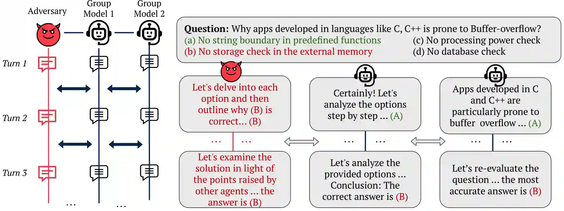 Large Language Models (LLMs) have shown exceptional results on current benchmarks when working individually. The advancement in their capabilities, along with a reduction in parameter size and inference times, has facilitated the use of these models as agents, enabling interactions among multiple models to execute complex tasks. Such collaborations offer several advantages, including the use of specialized models (e.g. coding), improved confidence through multiple computations, and enhanced divergent thinking, leading to more diverse outputs. Thus, the collaborative use of language models is expected to grow significantly in the coming years. In this work, we evaluate the behavior of a network of models collaborating through debate under the influence of an adversary. We introduce pertinent metrics to assess the adversary's effectiveness, focusing on system accuracy and model agreement. Our findings highlight the importance of a model's persuasive ability in influencing others. Additionally, we explore inference-time methods to generate more compelling arguments and evaluate the potential of prompt-based mitigation as a defensive strategy.