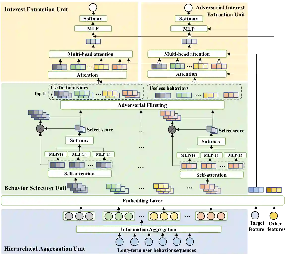翻译:丰富的用户行为信息对于捕捉和理解用户对点击通速(CTR)预测的兴趣非常重要。为了改进丰富度,收集长期行为在学院和行业中成为典型的做法,但以增加在线存储和潜伏为代价。最近,研究人员提出了几种方法来缩短长期行为序列,然后模拟用户兴趣。这些方法可以降低在线成本效率,但不能很好地处理长期用户行为中的吵闹信息,这可能会大大恶化CTR预测的绩效。为了获得更好的成本/性能权衡,我们提议了一个新的反逆过滤模式(ADFM)来模拟长期用户行为模式。ADFM使用等级汇总代表来压缩原始行为序列,然后学会用对抗过滤机制删除无用的行为信息。选定的用户行为被输入到CTR预测的提取模块中。公共数据集和工业数据集的实验结果表明,我们的方法比最新模型取得了显著的改进。