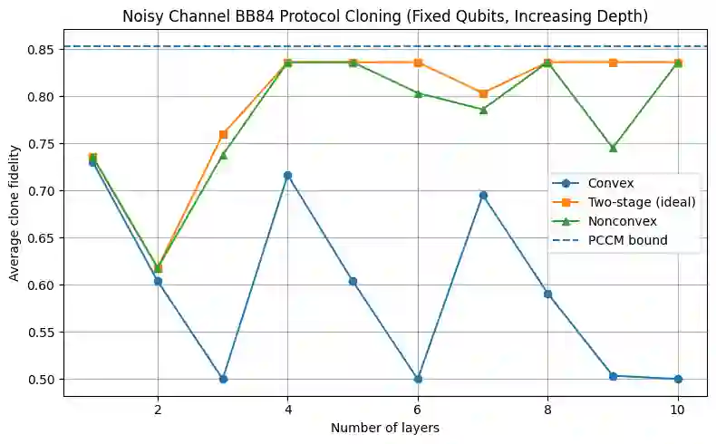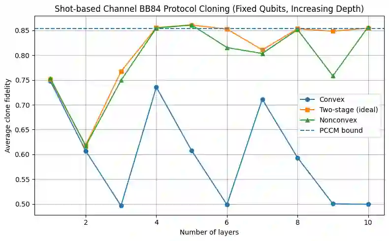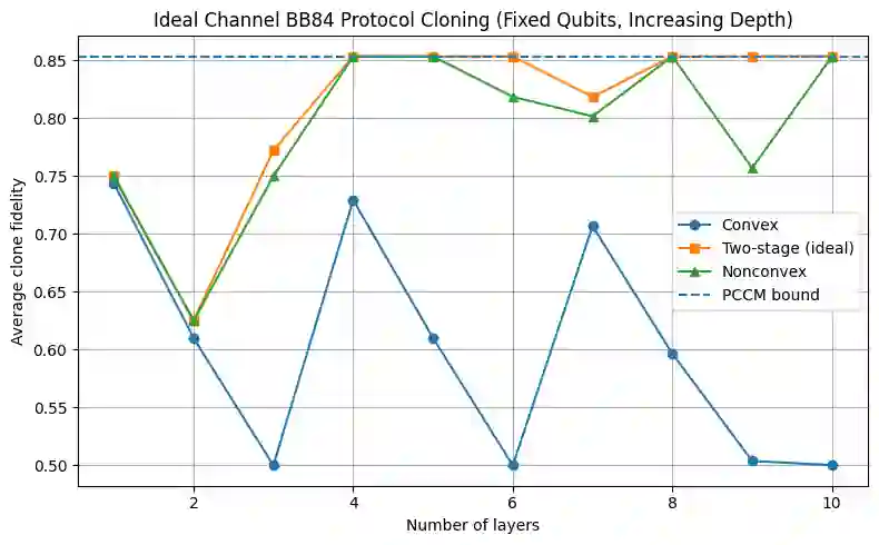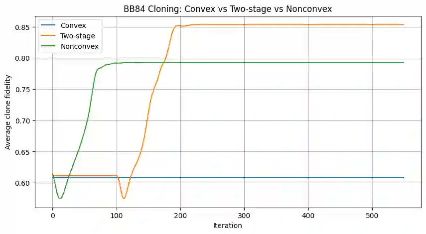翻译:变分量子算法是量子计算的重要组成部分。它融合了量子与经典方法,用于解决机器学习、化学和组合优化中的难题。然而随着算法规模扩大,它们无法避免贫瘠高原现象。当系统扩展时,梯度可能迅速消失,导致深度或随机初始化电路的训练几乎无法进行。为克服贫瘠高原问题,我们提出了一种两阶段优化框架。首先是凸初始化阶段:通过将量子能量景观(希尔伯特景观)塑造成平滑的低能盆地,使梯度更易识别并防止噪声干扰过程。获得稳定梯度流后,进入第二阶段:非凸优化阶段。该阶段允许算法探索不同能量极小值,从而增强模型表达能力。我们证明,所提算法通过黎曼流形优化,理论上降低了对底层量子最小二乘近似矩阵条件数的依赖。最后,我们应用该两阶段方案对量子密钥分发协议(即BB84)进行量子密码分析,以确定最优克隆策略。仿真结果表明,所提出的两阶段方案显著优于随机初始化方法。