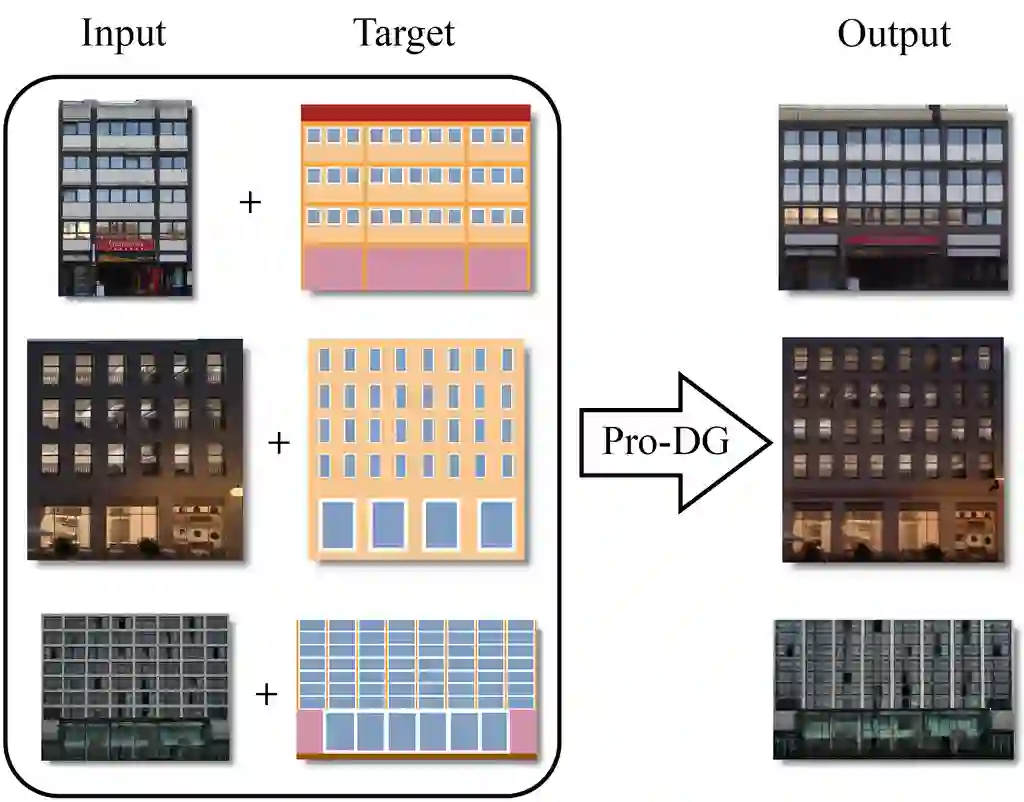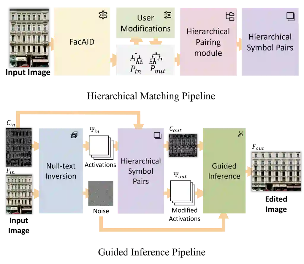 翻译:我们提出了Pro-DG,一个结合过程式形状语法与基于扩散的图像合成技术、用于实现过程式可控照片级真实感建筑立面生成的框架。从单张输入图像出发,我们首先利用语法规则重建其立面布局,然后通过用户定义的变换对该结构进行编辑。由于立面本质上是多层级结构,我们引入了一种层级匹配过程,用于在不同层级上对齐立面结构,并以此生成控制图来引导生成式扩散流程。该方法在保持局部外观保真度的同时,能够适应大规模编辑,例如楼层复制或窗户重新排列。我们进行了全面评估,将Pro-DG与基于修复的基线方法及合成真实数据进行了比较。我们的用户研究和定量测量结果表明,该方法在建筑特征保持和编辑准确性方面均有提升。这一新颖方法是首次将神经符号派生的形状语法建模与现代生成模型相结合,凸显了此类方法在实现精确可控图像处理方面的更广泛潜力。