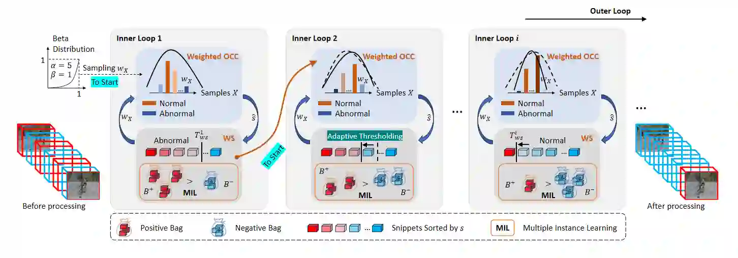 Without human annotations, a typical Unsupervised Video Anomaly Detection (UVAD) method needs to train two models that generate pseudo labels for each other. In previous work, the two models are closely entangled with each other, and it is not known how to upgrade their method without modifying their training framework significantly. Second, previous work usually adopts fixed thresholding to obtain pseudo labels, however the user-specified threshold is not reliable which inevitably introduces errors into the training process. To alleviate these two problems, we propose a novel interleaved framework that alternately trains a One-Class Classification (OCC) model and a Weakly-Supervised (WS) model for UVAD. The OCC or WS models in our method can be easily replaced with other OCC or WS models, which facilitates our method to upgrade with the most recent developments in both fields. For handling the fixed thresholding problem, we break through the conventional cognitive boundary and propose a weighted OCC model that can be trained on both normal and abnormal data. We also propose an adaptive mechanism for automatically finding the optimal threshold for the WS model in a loose to strict manner. Experiments demonstrate that the proposed UVAD method outperforms previous approaches.