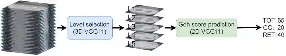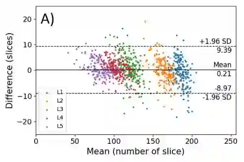 翻译:第二个(2D)网络接收2Dx轴切片,并预测得分。我们使用227 3D CT扫描对第一个网络进行培训和验证,其结果是1135 xial 切片在第二个网络中应用。我们因此提议了一个自动评分框架,由两个连锁的深度后退神经网络组成。第一个(3D)网络旨在预测三维CT扫描中五种解剖式评分水平的硬盘位置。第二个(2D)网络接收由此产生的2Dx轴切片,并预测了分数。我们使用227 3D CT 扫描来培训和验证第一个网络,其结果是1135 xial 切片在第二个网络中应用。两个专家独立获得一组数据,以获得一组内部和观察者之间的差异和所有数据的地面真相。为了缓解第二个网络中培训标签的不平衡,我们引入了取样合成数据的多样性、地面玻璃和再解释模式。四倍交叉校验显示,我们拟议的网络在0.90、1.66和0.49之间平均MAE、0.48和0.48 和0.4的地面预测中,分别完成了对0.46和0.48的计算。