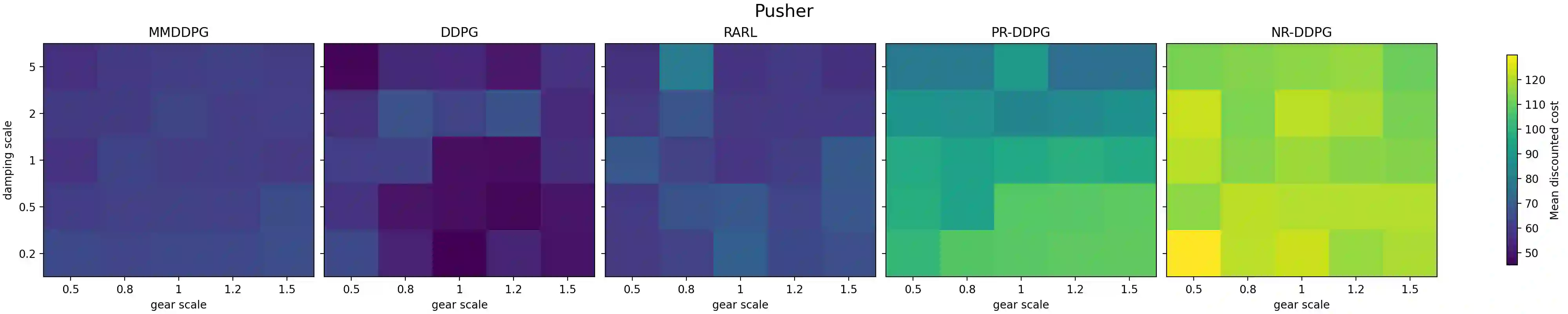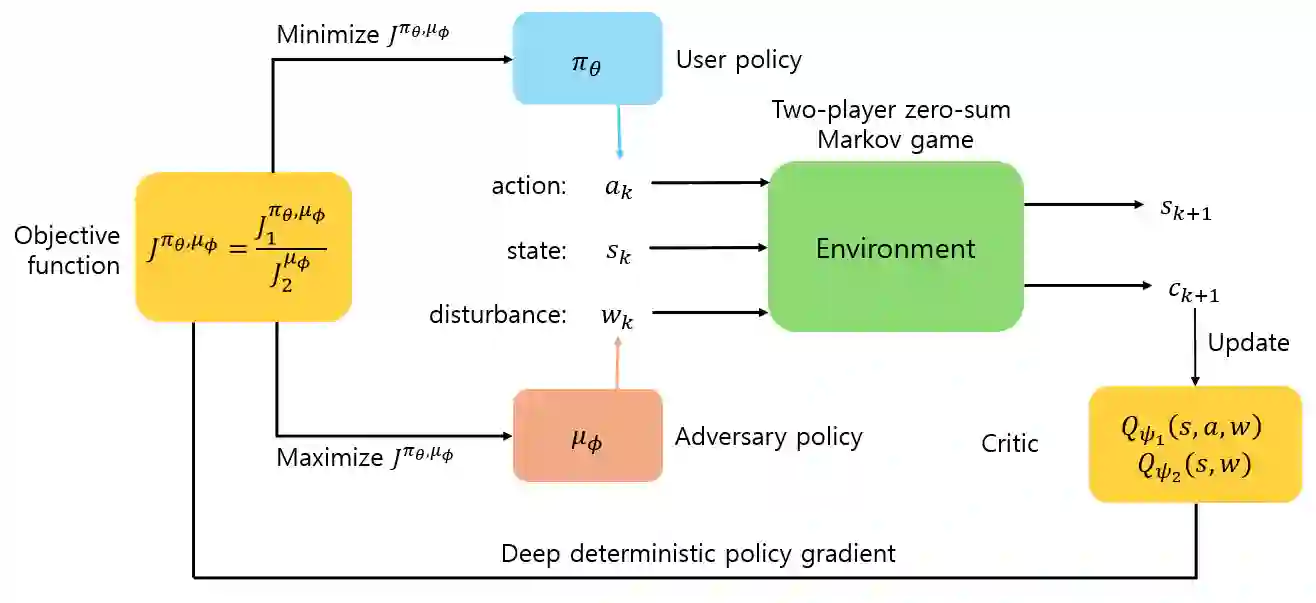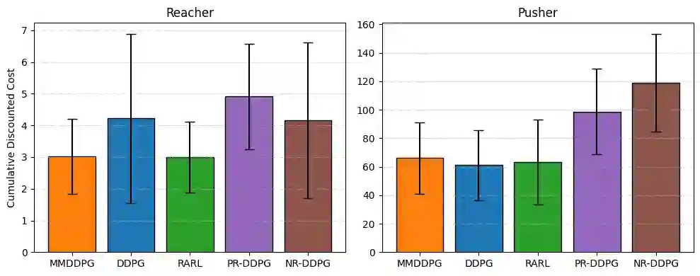 翻译:强化学习(RL)在广泛的控制与决策任务中取得了显著成功。然而,当RL智能体部署于存在意外外部干扰和模型不确定性的环境中时,其性能常表现出不稳定或退化。因此,确保在此类条件下的可靠性能仍是一个关键挑战。本文提出极小极大深度确定性策略梯度(MMDDPG),这是一个用于在连续控制任务中学习抗干扰策略的框架。训练过程被表述为用户策略与对抗性干扰策略之间的极小极大优化问题。在此问题中,用户学习一个最小化目标函数的鲁棒策略,而对抗者则生成最大化该目标函数的干扰。为稳定此交互过程,我们引入了一个平衡任务性能与干扰强度的分数目标。该目标可防止产生过度激进的干扰,并促进鲁棒学习。在MuJoCo环境中的实验评估表明,所提出的MMDDPG在面对外部力扰动和模型参数变化时,均实现了显著提升的鲁棒性。