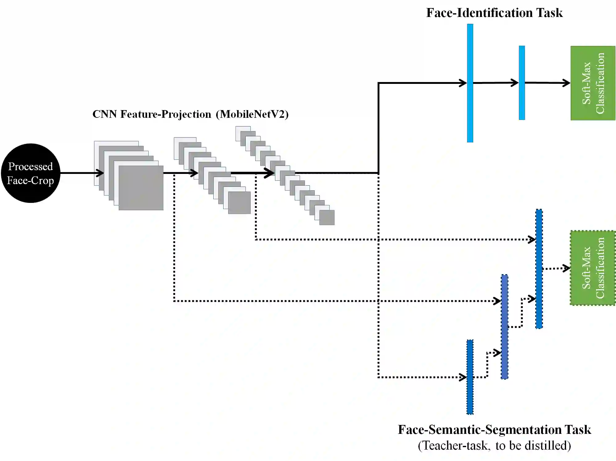 翻译:本文展示了一种利用语义分隔特征改进表面识别面貌差异的新办法。 拟议的Seg- 蒸馏- ID 网络联合学习识别和语义分隔任务, 分解任务随后“ 蒸馏 ” (mobileNet 编码器) 。 业绩以公开可得的数据集上的三个最先进的编码器为基准,强调头项差别。 实验评估显示,Seg- 蒸馏- ID 网络显示出显著的稳健性效益,在ResNet- 101上实现了99.9%的测试- 准确性,在ResNet- 101上实现了81.6%,在VGG-19上实现了96.1%的测试- 准确性,在受感官V3中实现了96.3%的测试- 。 这是使用大约十分之一的顶层编码推断参数实现的。 这些结果表明, 蒸馏语义分解特性能够有效地解决表面识别的容变差。