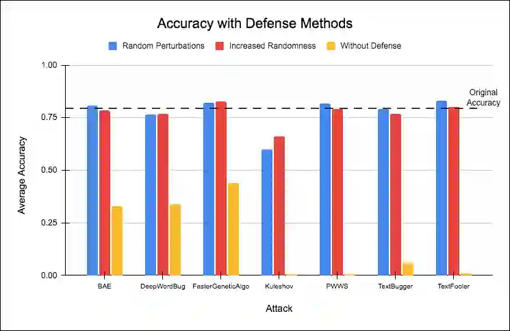 Attacks on deep learning models are often difficult to identify and therefore are difficult to protect against. This problem is exacerbated by the use of public datasets that typically are not manually inspected before use. In this paper, we offer a solution to this vulnerability by using, during testing, random perturbations such as spelling correction if necessary, substitution by random synonym, or simply dropping the word. These perturbations are applied to random words in random sentences to defend NLP models against adversarial attacks. Our Random Perturbations Defense and Increased Randomness Defense methods are successful in returning attacked models to similar accuracy of models before attacks. The original accuracy of the model used in this work is 80% for sentiment classification. After undergoing attacks, the accuracy drops to accuracy between 0% and 44%. After applying our defense methods, the accuracy of the model is returned to the original accuracy within statistical significance.