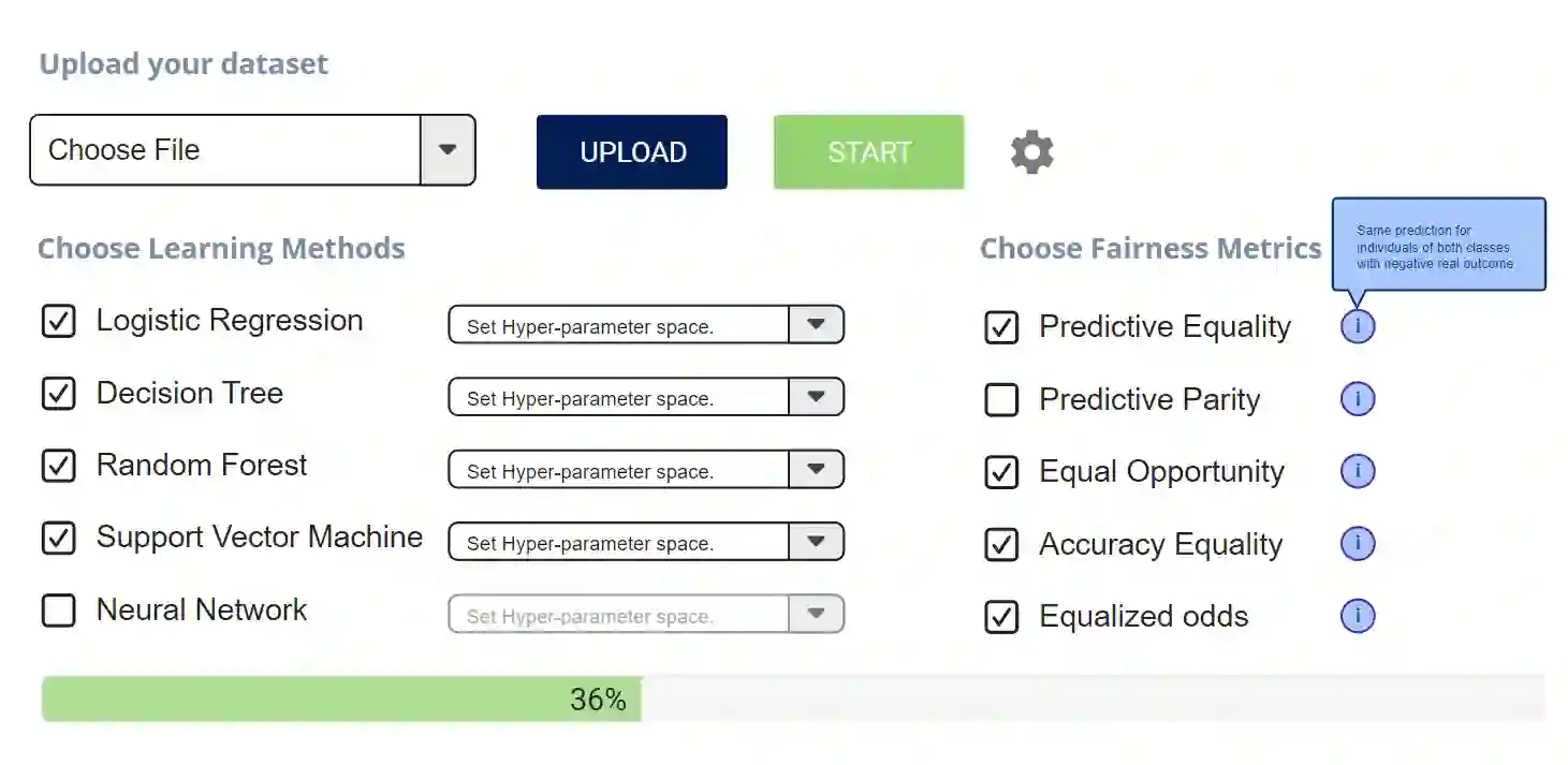 翻译:虽然机器学习(ML)在高风险决策领域中具有潜在优势,但ML的部署对从业人员来说并不可接受,存在歧视的风险。 在这些领域建立对ML的信任和接受,民主化ML工具和考虑公平性至关重要。 在本文中,我们介绍了FairPilot,一个交互式系统,旨在通过探索各种模型、不同超参数和各种公平性定义的组合来促进ML模型的负责开发。 我们强调选择“最佳”ML模型的挑战,并演示了如何使用FairPilot选择一组评估标准,然后将模型和超参数的Pareto前沿线作为交互式地图显示给用户。 FairPilot是首个结合这些功能的系统,为用户负责选择其模型提供了独特的机会。