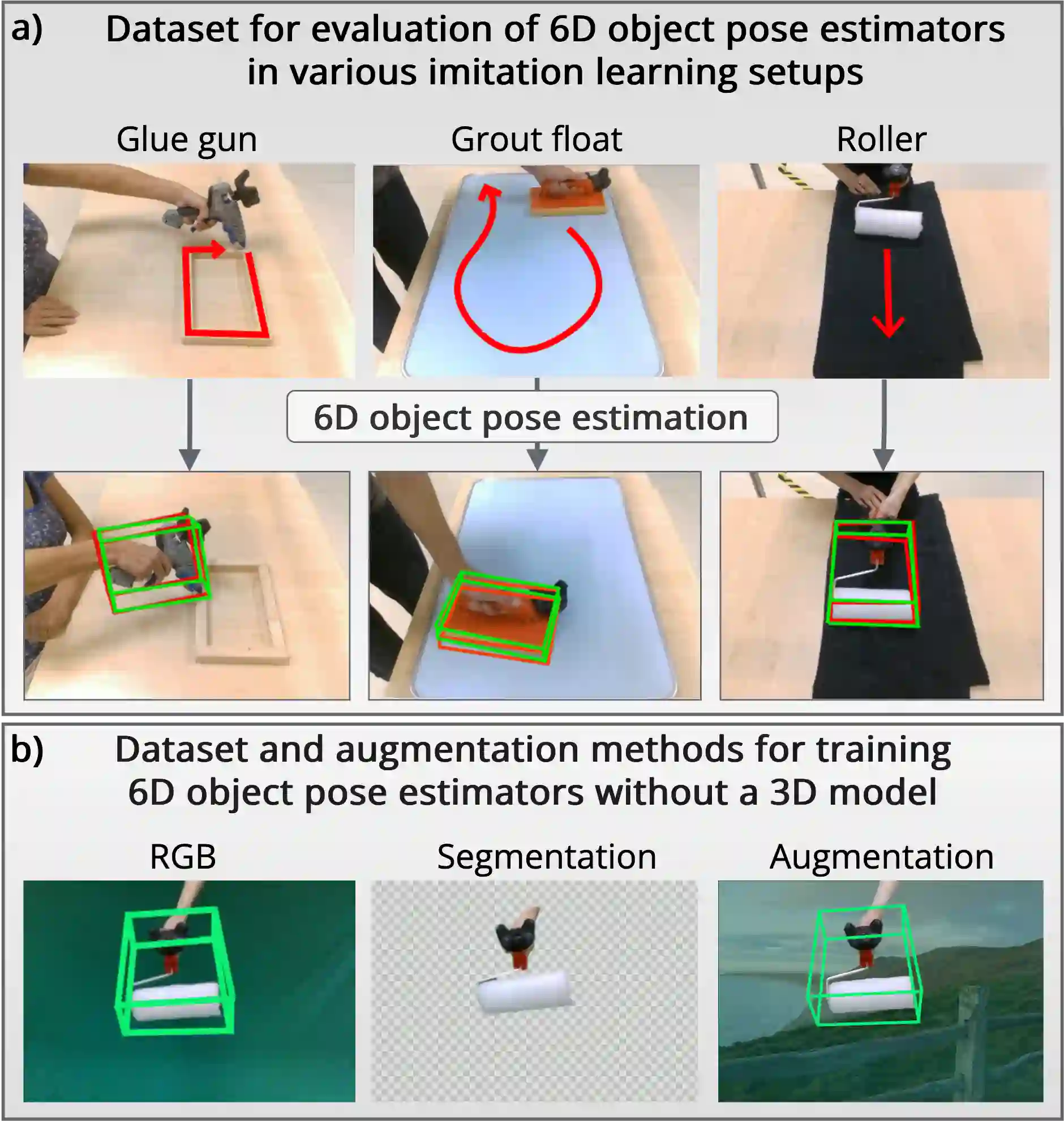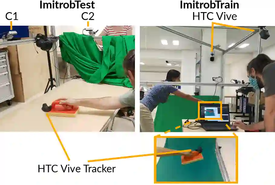 翻译:本文介绍了用于培训和评价6D构成一种标准 RGB 相机所摄任务演示的手持工具的数据集。 尽管 6D 构成估计方法取得了显著的进展,但其性能通常限于严重隐蔽的物体,这是模仿学习中常见的一个常见案例,即该物体通常被操纵手部分隐蔽。目前,缺少数据集,以便能够为这些条件制定稳健的6D 构成估计方法。为了克服这一问题,我们收集了一套新的数据集(Imitrob),旨在6D 构成模拟学习和其他应用程序中的估计,其中一个人持有一个工具并执行一项任务。该数据集包含三个不同工具的图像序列和六个操作任务,有两种相机视角,四个人类主体和左/右手。每张图像都配有由HTC Vive 动作跟踪装置获得的6D 构成的准确地面真象测量。通过培训和评估最近的6D 对象在各种设置中显示该数据集的使用情况。数据设置和代码可在 http://imovirp. httpset/trobridata.