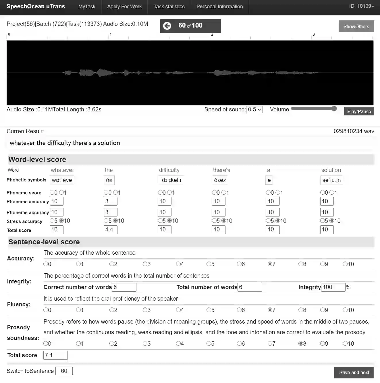 翻译:本文介绍一个新的开放源码语音材料,名为“Speech Oceans762”,用于读音评估,由250名非母语发言者(其中一半为儿童)的5 000个英语词句组成,其中一半为儿童,五名专家在判决、字级和电话级各附加说明,一个基线系统在公开源码中发布,以说明该文体的电话-音级读音评估工作流程,允许免费用于商业和非商业目的,可免费从开放空间服务中心下载,相应的基线系统在Kaldi语音识别工具包中公布。