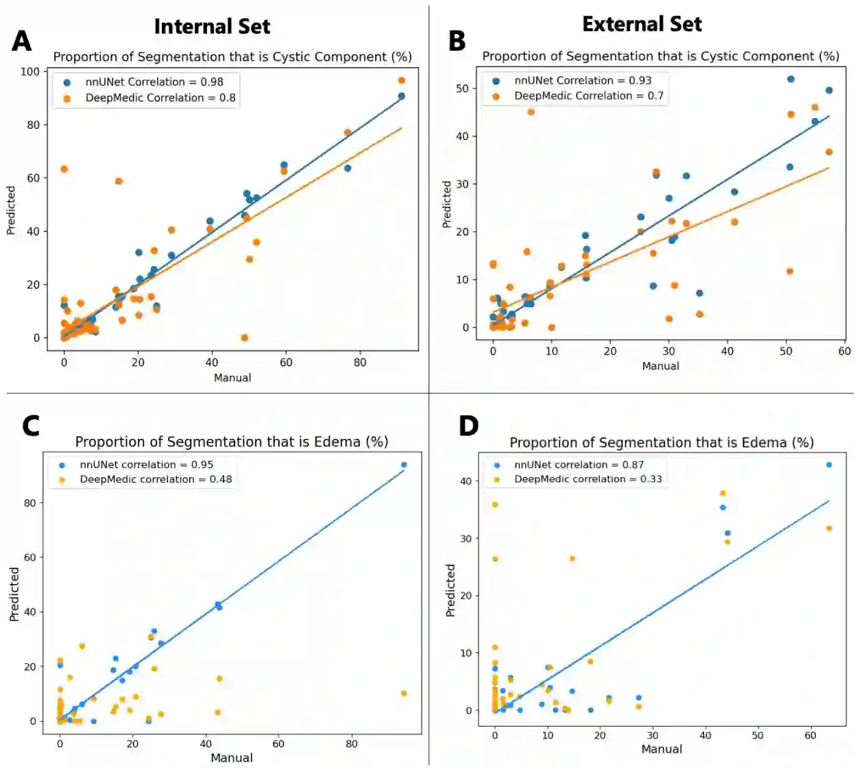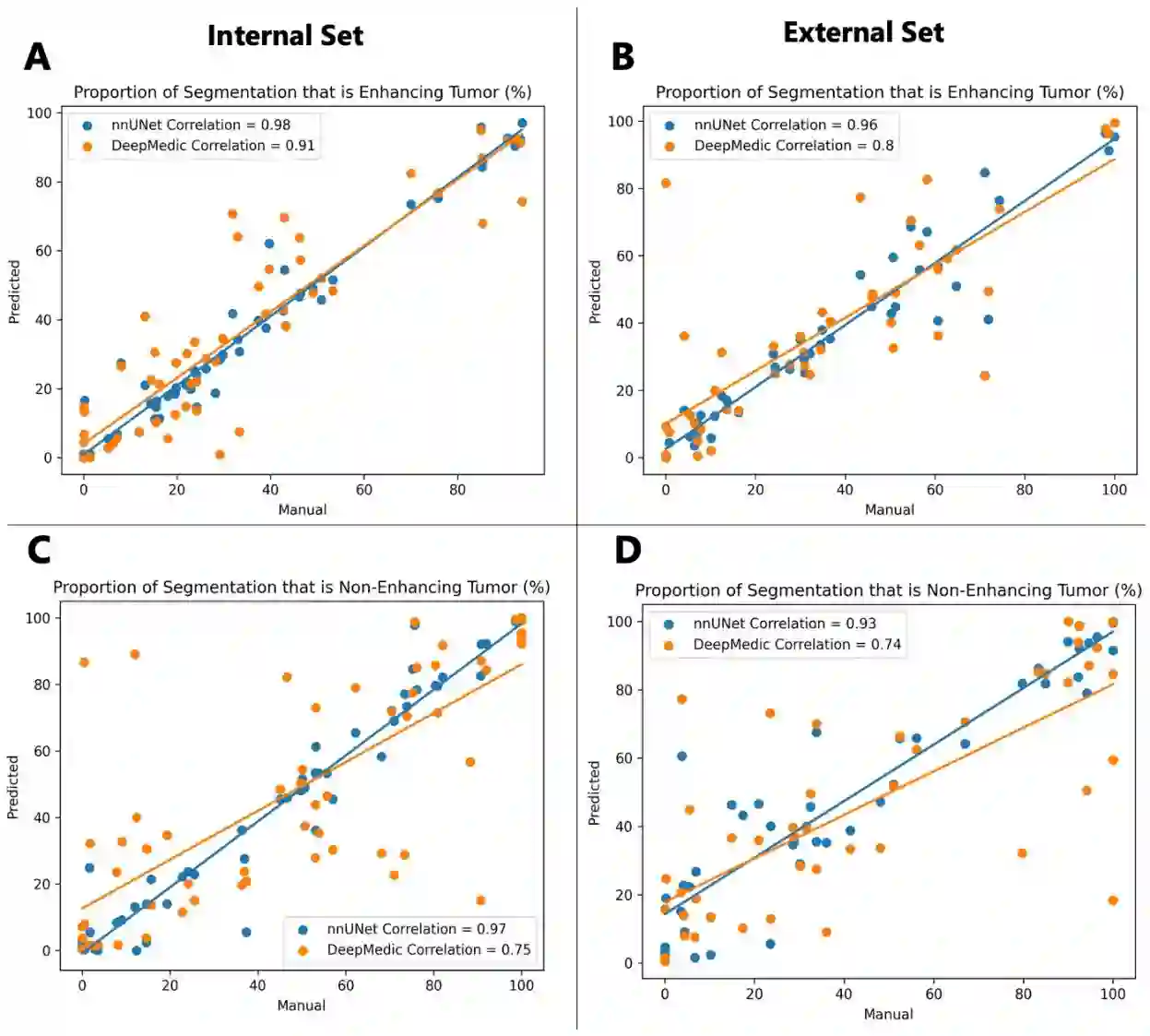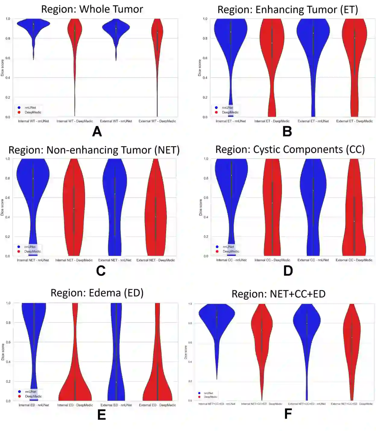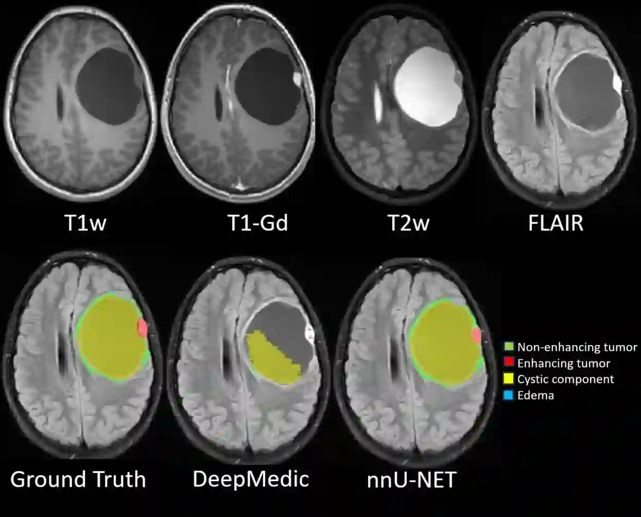 Brain tumors are the most common solid tumors and the leading cause of cancer-related death among children. Tumor segmentation is essential in surgical and treatment planning, and response assessment and monitoring. However, manual segmentation is time-consuming and has high inter-operator variability, underscoring the need for more efficient methods. We compared two deep learning-based 3D segmentation models, DeepMedic and nnU-Net, after training with pediatric-specific multi-institutional brain tumor data using based on multi-parametric MRI scans.Multi-parametric preoperative MRI scans of 339 pediatric patients (n=293 internal and n=46 external cohorts) with a variety of tumor subtypes, were preprocessed and manually segmented into four tumor subregions, i.e., enhancing tumor (ET), non-enhancing tumor (NET), cystic components (CC), and peritumoral edema (ED). After training, performance of the two models on internal and external test sets was evaluated using Dice scores, sensitivity, and Hausdorff distance with reference to ground truth manual segmentations. Dice score for nnU-Net internal test sets was (mean +/- SD (median)) 0.9+/-0.07 (0.94) for WT, 0.77+/-0.29 for ET, 0.66+/-0.32 for NET, 0.71+/-0.33 for CC, and 0.71+/-0.40 for ED, respectively. For DeepMedic the Dice scores were 0.82+/-0.16 for WT, 0.66+/-0.32 for ET, 0.48+/-0.27, for NET, 0.48+/-0.36 for CC, and 0.19+/-0.33 for ED, respectively. Dice scores were significantly higher for nnU-Net (p<=0.01). External validation of the trained nnU-Net model on the multi-institutional BraTS-PEDs 2023 dataset revealed high generalization capability in segmentation of whole tumor and tumor core with Dice scores of 0.87+/-0.13 (0.91) and 0.83+/-0.18 (0.89), respectively. Pediatric-specific data trained nnU-Net model is superior to DeepMedic for whole tumor and subregion segmentation of pediatric brain tumors.