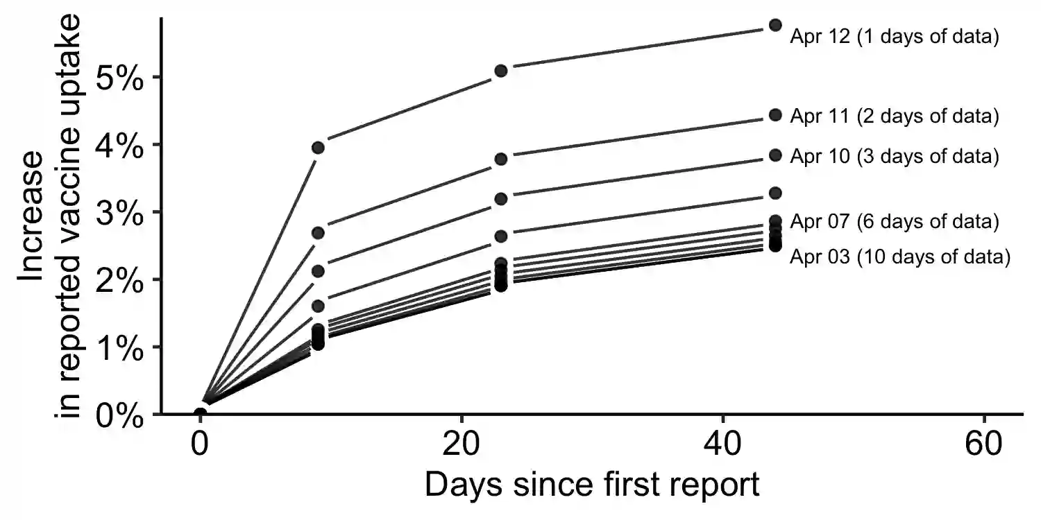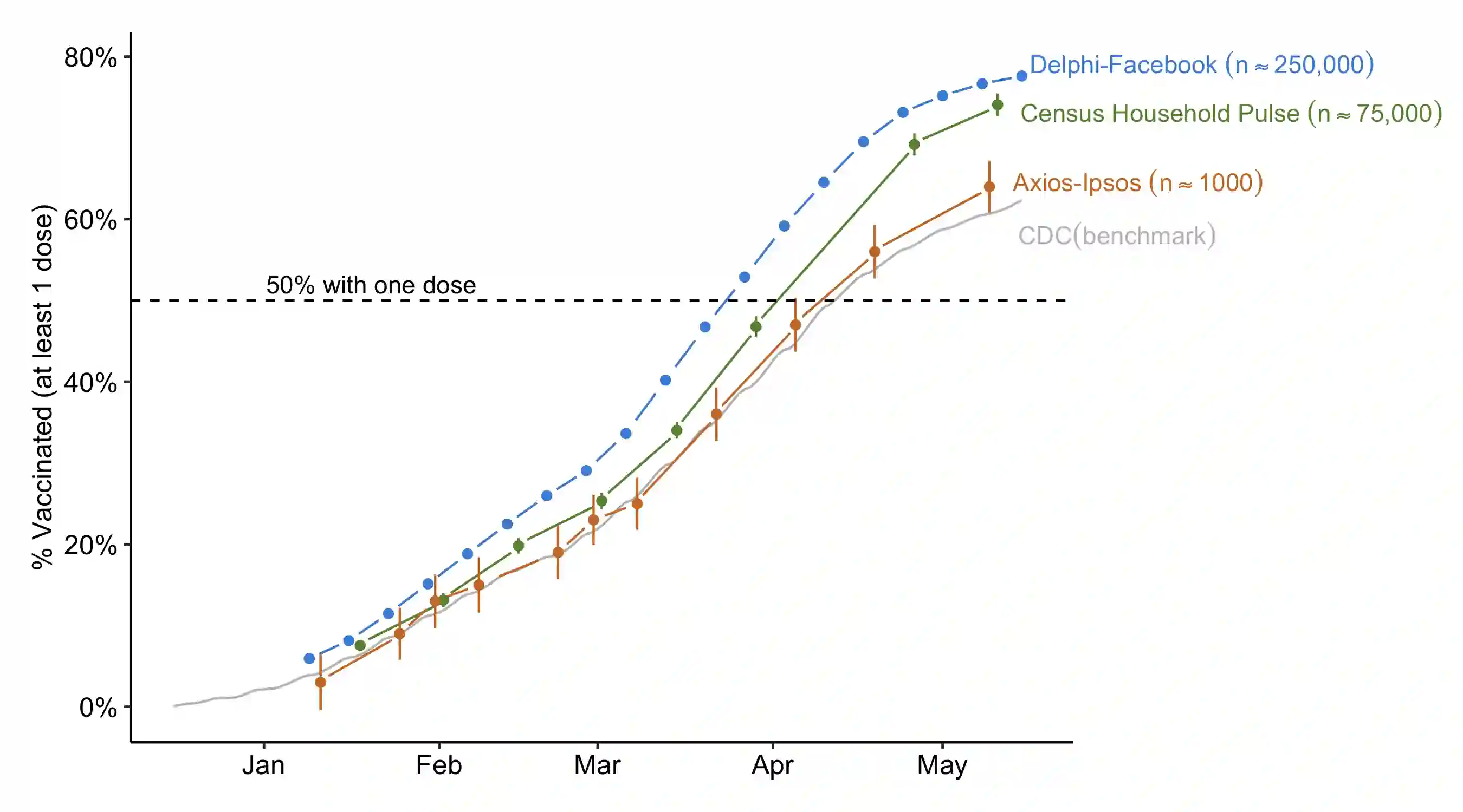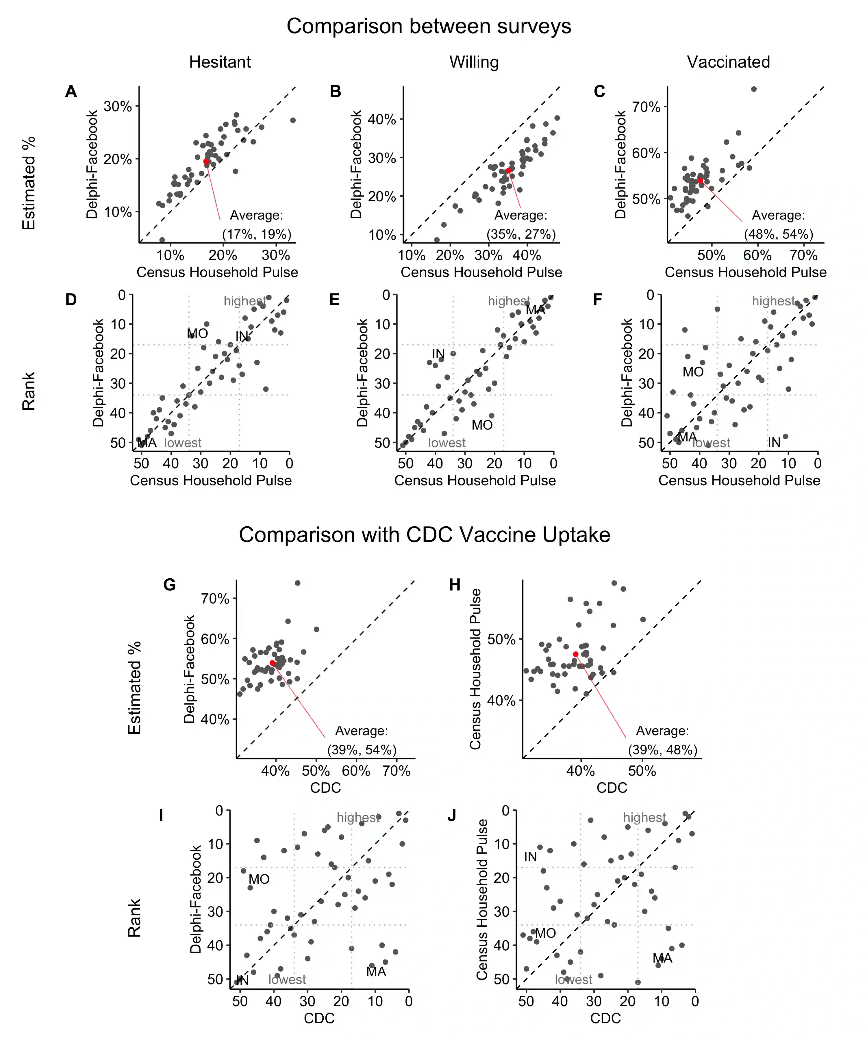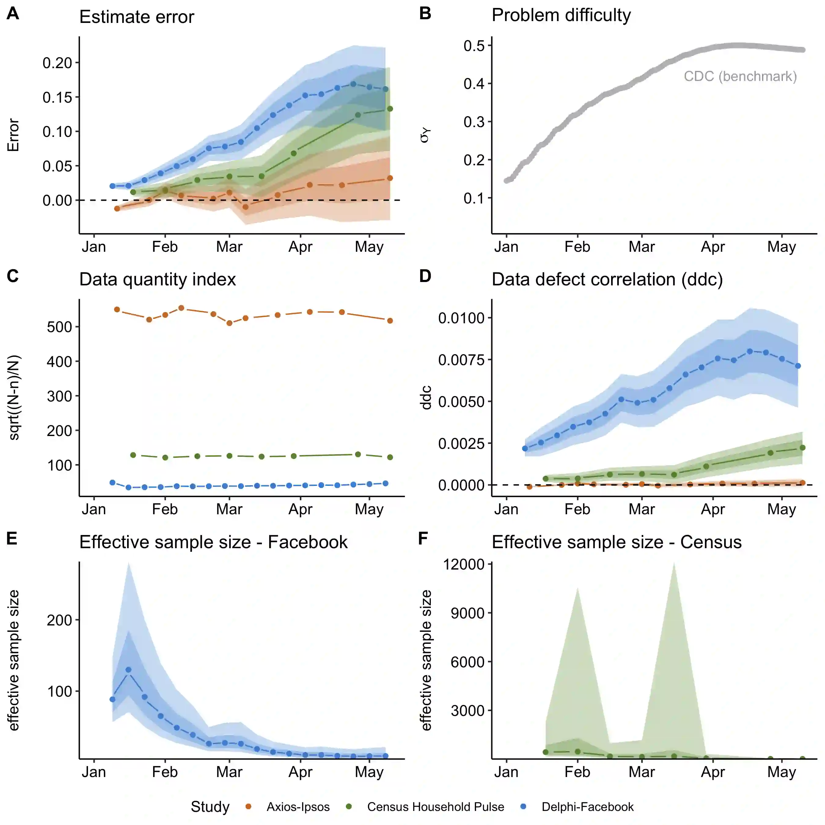 翻译:控制COVID-19大流行的公共卫生工作取决于准确的调查,然而,Delphi-Facebook、Census Pulse和Axios-Ipsos调查对美国接种疫苗情况的估计显示大数据奇数:调查越大,其估计数就越是根据疾病控制和预防中心(CDC)的基准提出的。 2021年4月,最大的调查Delphi-Facebook高估了20个百分点的疫苗摄取率。 疫苗意愿和偏执(没有基准)的估计数之间的差异也随着时间的增长而增加,不能仅仅通过对传统人口变量的选择偏见来解释。 然而,最近关于调查大数据质量的框架(Meng,Annals of Appical Statistics, 2018)使我们能够量化贡献因素,并提供以数据质量驱动的疫苗意愿和偏重度情景分析。