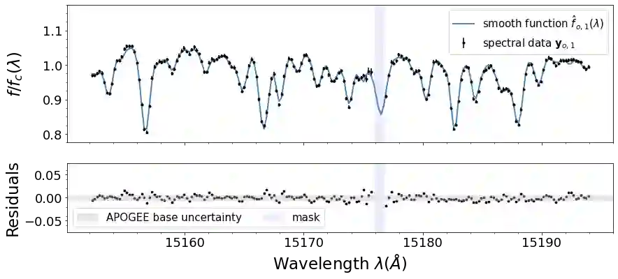 翻译:高分辨率光谱测量 {Nal04{Nalm047} 银河系已进入了大数据系统,并开辟了解决在银河系考古学中未决问题的渠道。然而,充分利用其全部潜力受到复杂的系统化的制约,现代光谱分析没有对其特性给予足够的关注。在这项工作中,我们提出了一个新颖的方法,将恒星固有的光学数据空间部分与系统性分开。在APOGE的18,933美元巨光谱样本中,我们发现,超过观测不确定性水平的内在结构需要$_Approx}10美元功能性主要组成部分。我们的FPC可以降低星光谱的维度,消除系统化,并且能够准确研究恒星层。为了展示我们FPC的实用性,我们用它们来推导出在开放的 m67 组中 28 美元的巨量参数和丰度。我们用Sqernal 类似值,一个模拟的Bayescial dismal dismlate 方法, 能够学习恒度的内分解磁值。