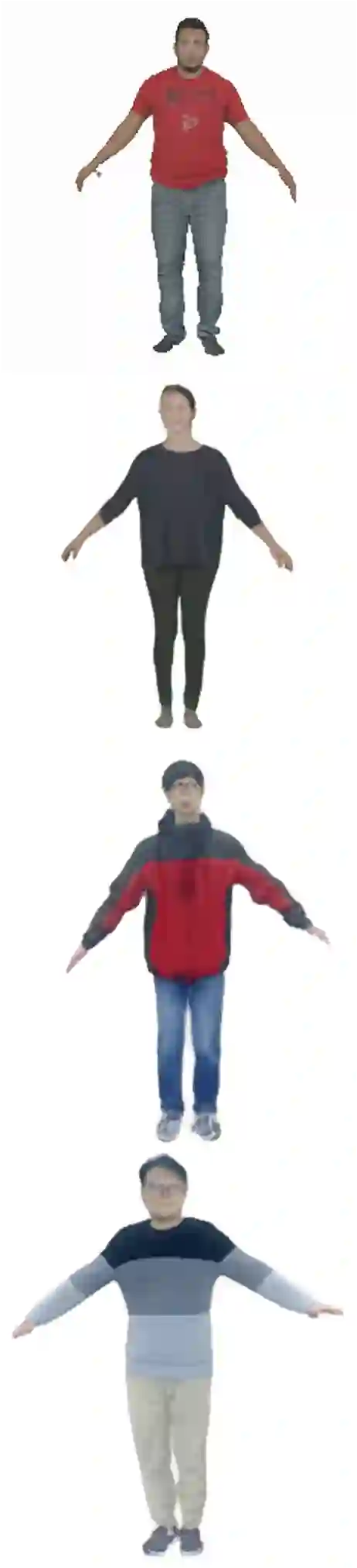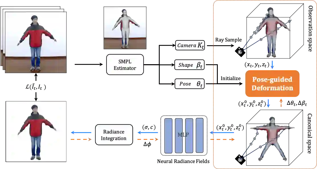 翻译:我们用单视录象来展示人造动的详细神经光亮场。我们的方法通过在学习场景展示网络的同时引入清晰的外形引导变形,将神经光亮场延伸到人类运动的动态场景。特别是,我们估计每个框架的人类面貌,并学习详细的人类样板的常态光亮空间,使人类从观察空间自然形状变形到由表面参数明确控制的金字塔空间。为了弥补不准确的外观估计,我们引入了在学习过程中更新最初面貌的外形改进战略,这不仅有助于学习更准确的人类重建,而且还加快了趋同速度。在实验中,我们证明拟议方法取得了以下成果:(1) 隐含的人类几何学和外观重建,具有高质量的细节,(2) 人类从新观点中呈现出真实的图像,以及(3) 人造新面的动画。