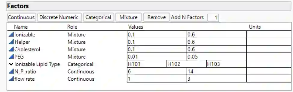 翻译:这项工作总结了“设计质量”(QbD)风格的优化油脂纳米粒子配方的方法,目的是为科学家提供一个无障碍的工作流程。这些研究中的限制是,可移植、辅助和PEG脂质的摩尔比率加起来高达100%,需要修改设计和分析方法,以适应这种混合物的制约。侧重于在液态生产设计优化中常用的脂质和工艺因素,我们提供务实的建议,以避免在分析包括混合因素在内的实验中历来产生的困难,并表明最近开发的自我验证合用模型(SVEM)的统计框架如何能够同时简化对混合物过程实验结果的分析,提高候选最佳配方的质量。这些步骤以运行的实例为例。我们还根据简化对结果解释的完善模型提供图形工具,便利以确认运行或增强设计的形式进行后续研究的设计。