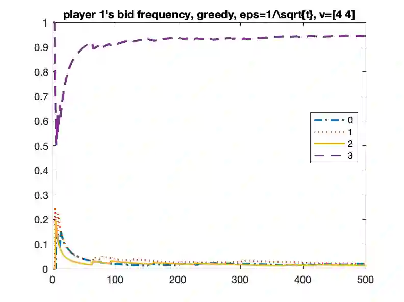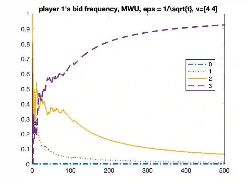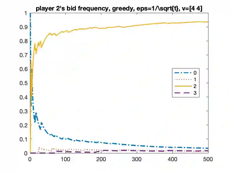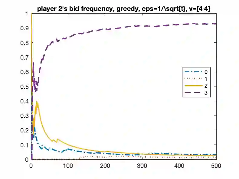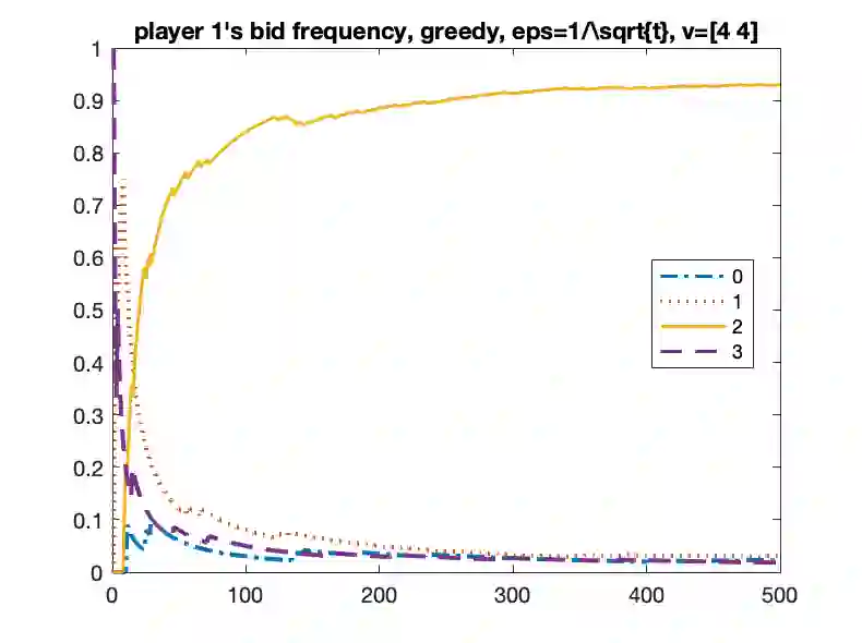翻译:了解反复拍卖中学习动态的趋同特性是一个及时而重要的问题,在拍卖中学习的学习动态领域是一个及时而重要的问题,在网上广告市场等许多应用中,这项工作侧重于重复第一次价格拍卖,对项目有固定价值的投标人学习使用平均算法进行投标 -- -- 大量的在线学习算法,其中包括流行的无回报算法,如多复制性 Weights Uddate和顺从受困领导人。我们从两个角度,将基于平均值的算法与拍卖的纳什平衡趋同为一体:(1) 平均时间:(1) 投标人玩纳什均衡办法1的回合的分数;(2) 最新时间:投标人的混合战略组合在限度内接近纳什均衡。具体地说,结果取决于价值最高的投标人数目:如果数字至少是三个,则投标动态几乎必然会与拍卖的纳什平衡相趋同,无论是在时间平均开放还是最后时间上。 - 如果数字是两个,投标动态几乎肯定地接近纳什均衡,在时间上可能不会达到一个平均结果。