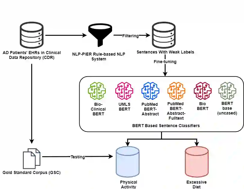 翻译:由于对阿尔茨海默氏病(AD)没有有效的治疗方法,因此,通过生活方式因素的变化和干预,预防已变得更加重要。分析AD病人的电子健康记录(EHR)有助于我们更好地了解生活方式对AD的影响。然而,生活方式信息通常储存在临床叙述中。因此,研究的目的是证明自然语言处理模式的可行性,以便从临床文本中分类生活方式因素(例如,体育活动和过量饮食)。我们通过使用基于规则的NLP算法,自动为培训数据制作标签。我们对来自变压器(BERT)的预先培训双向电解码显示模型(EECD)对高标签的模型进行薄弱的监管,这些模型包括BERT的基础模型、PubMERT(摘要+全文)、PubMedBERT(仅摘要)、统一医学语言系统(UMLS)BERT、生物模型模型BERT和生物临床BERT。我们进行了两项案例研究:物理活动和过量饮食研究,以便验证BERERER模型在将FERS的精确度指标分类中进行两次测试的成绩分析,这些模型显示其最精确性研究。