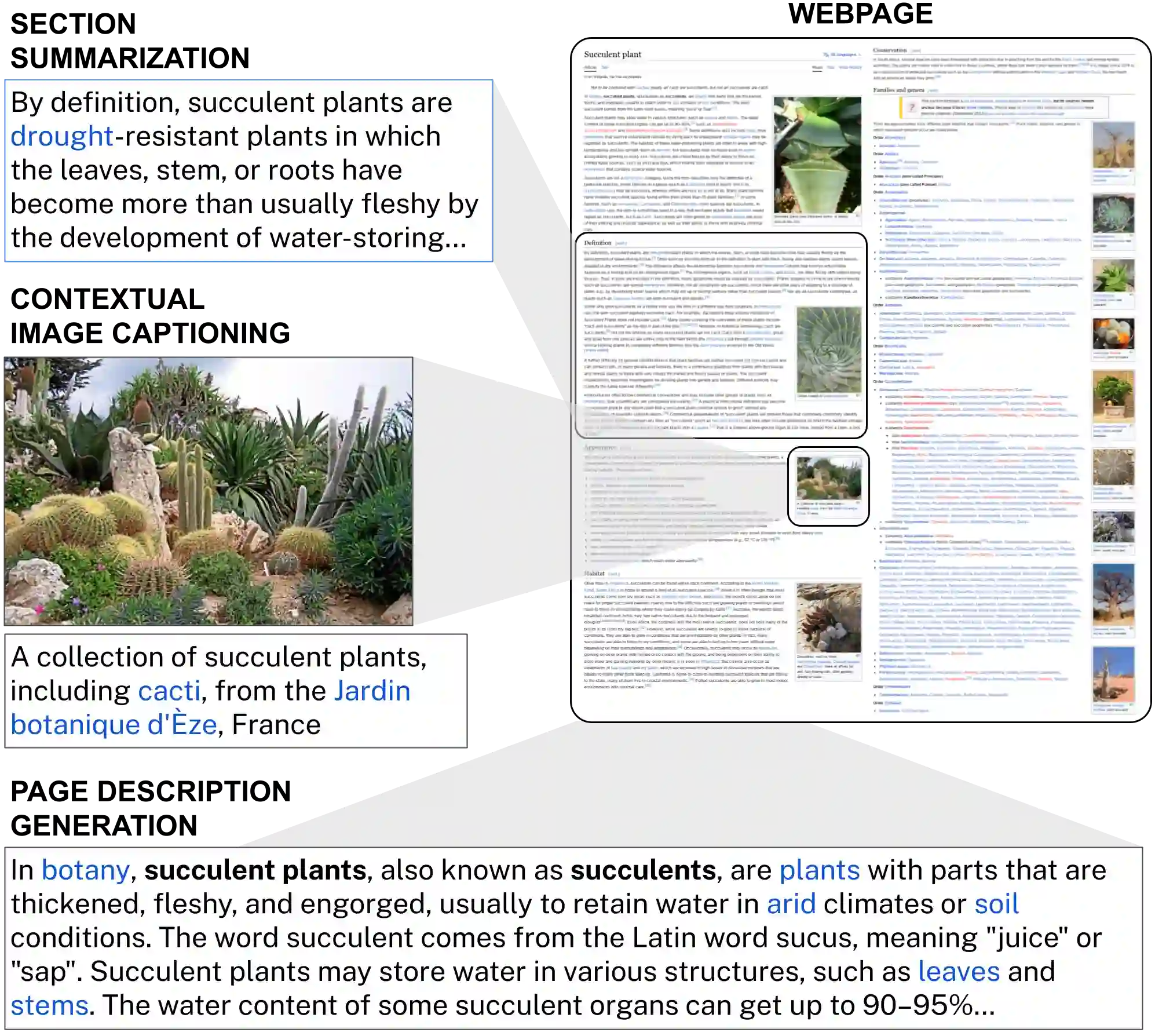 Webpages have been a rich, scalable resource for vision-language and language only tasks. Yet only pieces of webpages are kept: image-caption pairs, long text articles, or raw HTML, never all in one place. Webpage tasks have resultingly received little attention and structured image-text data left underused. To study multimodal webpage understanding, we introduce the Wikipedia Webpage suite (WikiWeb2M) of 2M pages. We verify its utility on three generative tasks: page description generation, section summarization, and contextual image captioning. We design a novel attention mechanism Prefix Global, which selects the most relevant image and text content as global tokens to attend to the rest of the webpage for context. By using page structure to separate such tokens, it performs better than full attention with lower computational complexity. Experiments show that the new annotations from WikiWeb2M improve task performance compared to data from prior work. We also include ablations on sequence length, input features, and model size.