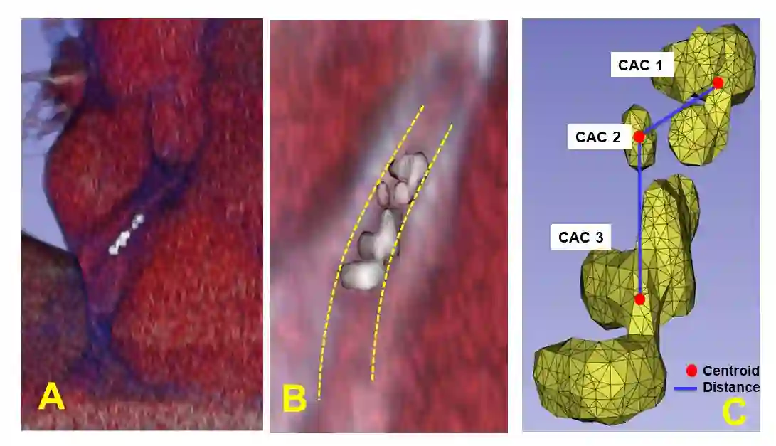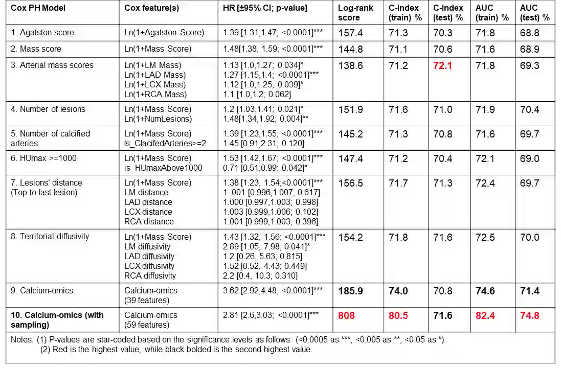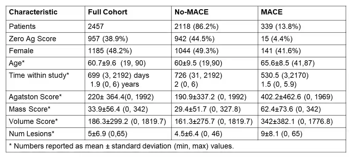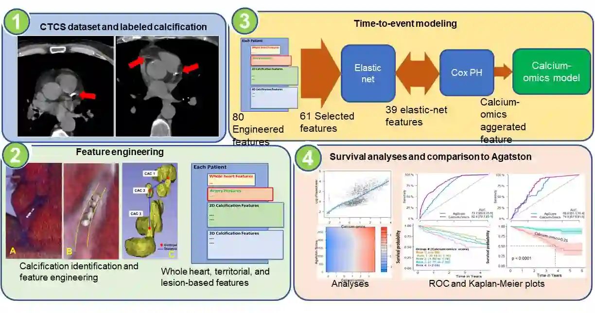 Background. Coronary artery calcium (CAC) is a powerful predictor of major adverse cardiovascular events (MACE). Traditional Agatston score simply sums the calcium, albeit in a non-linear way, leaving room for improved calcification assessments that will more fully capture the extent of disease. Objective. To determine if AI methods using detailed calcification features (i.e., calcium-omics) can improve MACE prediction. Methods. We investigated additional features of calcification including assessment of mass, volume, density, spatial distribution, territory, etc. We used a Cox model with elastic-net regularization on 2457 CT calcium score (CTCS) enriched for MACE events obtained from a large no-cost CLARIFY program (ClinicalTri-als.gov Identifier: NCT04075162). We employed sampling techniques to enhance model training. We also investigated Cox models with selected features to identify explainable high-risk characteristics. Results. Our proposed calcium-omics model with modified synthetic down sampling and up sampling gave C-index (80.5%/71.6%) and two-year AUC (82.4%/74.8%) for (80:20, training/testing), respectively (sampling was applied to the training set only). Results compared favorably to Agatston which gave C-index (71.3%/70.3%) and AUC (71.8%/68.8%), respectively. Among calcium-omics features, numbers of calcifications, LAD mass, and diffusivity (a measure of spatial distribution) were important determinants of increased risk, with dense calcification (>1000HU) associated with lower risk. The calcium-omics model reclassified 63% of MACE patients to the high risk group in a held-out test. The categorical net-reclassification index was NRI=0.153. Conclusions. AI analysis of coronary calcification can lead to improved results as compared to Agatston scoring. Our findings suggest the utility of calcium-omics in improved prediction of risk.