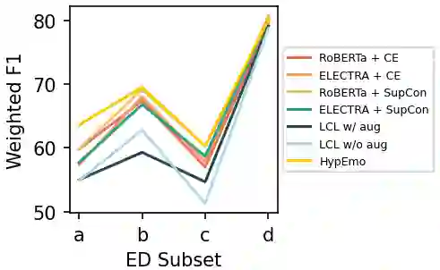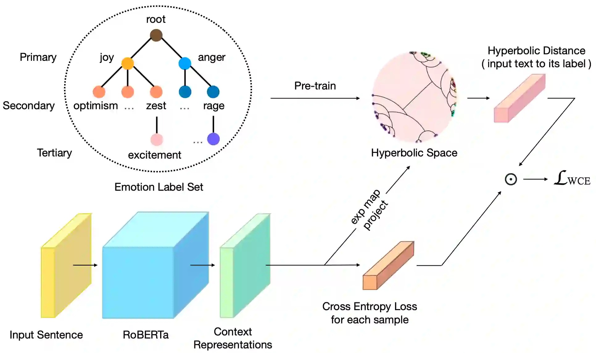 Fine-grained emotion classification (FEC) is a challenging task. Specifically, FEC needs to handle subtle nuance between labels, which can be complex and confusing. Most existing models only address text classification problem in the euclidean space, which we believe may not be the optimal solution as labels of close semantic (e.g., afraid and terrified) may not be differentiated in such space, which harms the performance. In this paper, we propose HypEmo, a novel framework that can integrate hyperbolic embeddings to improve the FEC task. First, we learn label embeddings in the hyperbolic space to better capture their hierarchical structure, and then our model projects contextualized representations to the hyperbolic space to compute the distance between samples and labels. Experimental results show that incorporating such distance to weight cross entropy loss substantially improves the performance with significantly higher efficiency. We evaluate our proposed model on two benchmark datasets and found 4.8% relative improvement compared to the previous state of the art with 43.2% fewer parameters and 76.9% less training time. Code is available at https: //github.com/dinobby/HypEmo.