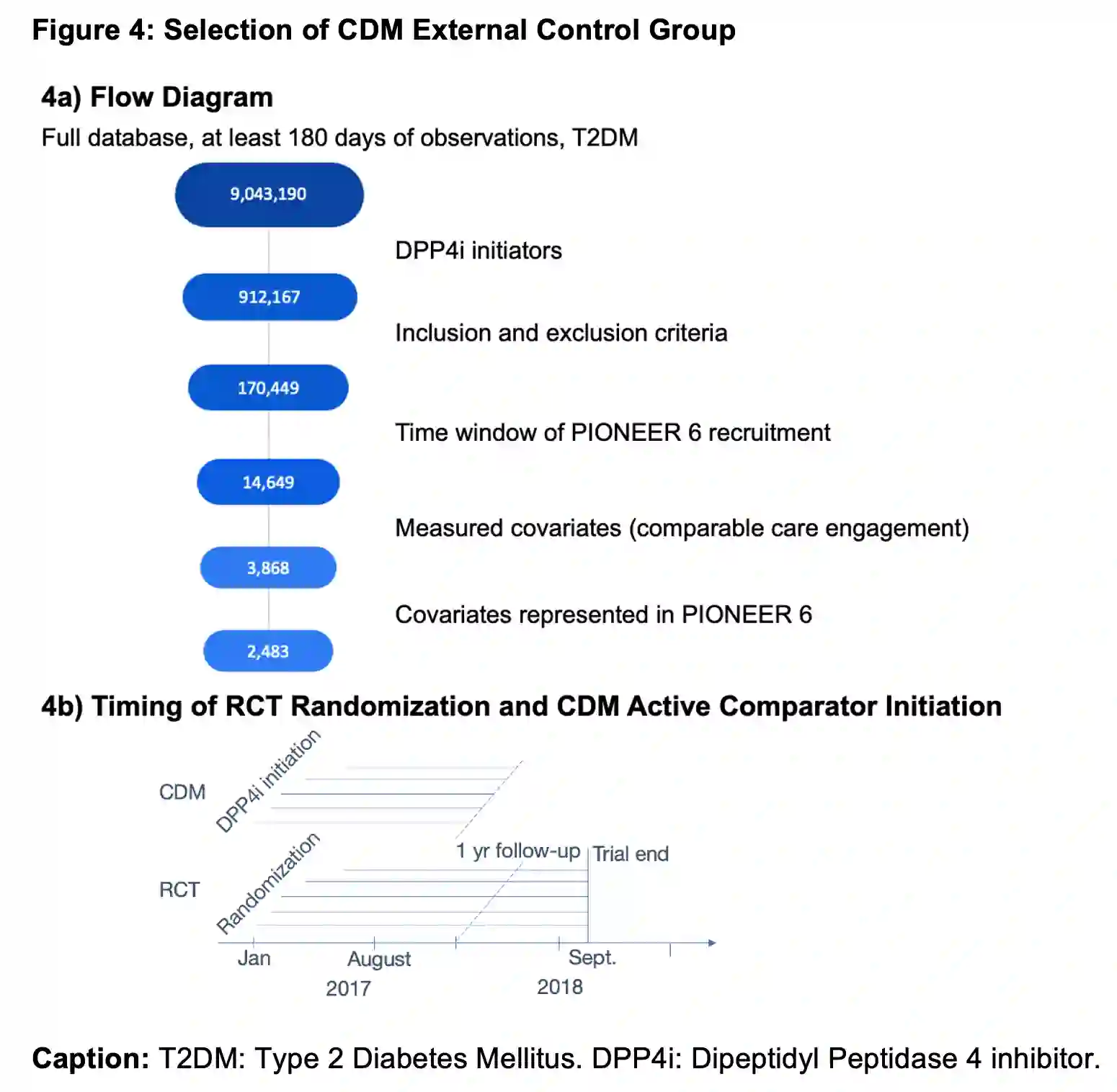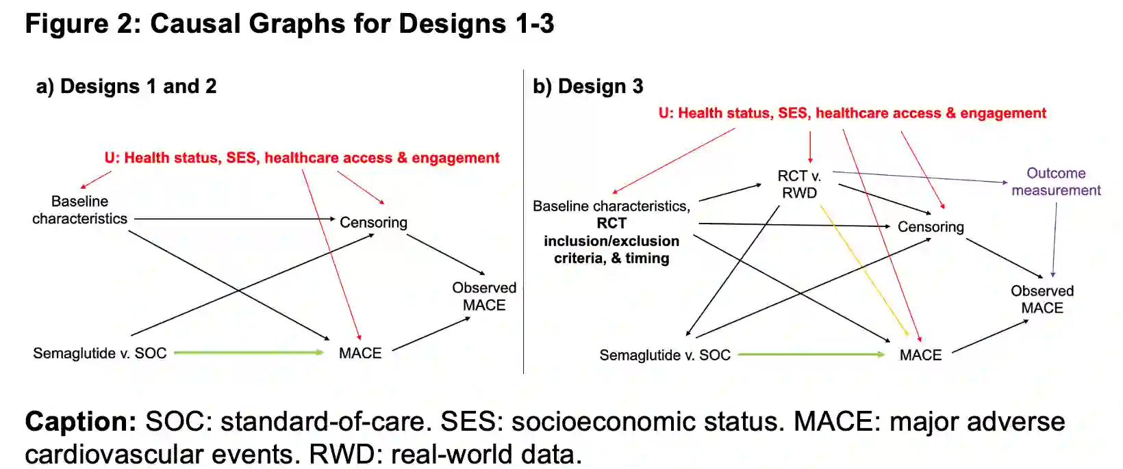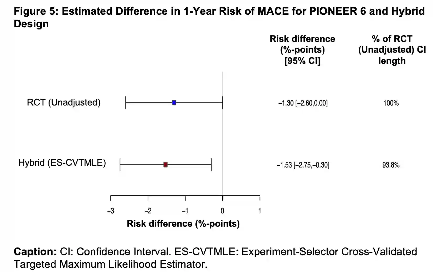 Introduction: Increasing interest in real-world evidence has fueled the development of study designs incorporating real-world data (RWD). Using the Causal Roadmap, we specify three designs to evaluate the difference in risk of major adverse cardiovascular events (MACE) with oral semaglutide versus standard-of-care: 1) the actual sequence of non-inferiority and superiority randomized controlled trials (RCTs), 2) a single RCT, and 3) a hybrid randomized-external data study. Methods: The hybrid design considers integration of the PIONEER 6 RCT with RWD controls using the experiment-selector cross-validated targeted maximum likelihood estimator. We evaluate 95% confidence interval coverage, power, and average patient-time during which participants would be precluded from receiving a glucagon-like peptide-1 receptor agonist (GLP1-RA) for each design using simulations. Finally, we estimate the effect of oral semaglutide on MACE for the hybrid PIONEER 6-RWD analysis. Results: In simulations, Designs 1 and 2 performed similarly. The tradeoff between decreased coverage and patient-time without the possibility of a GLP1-RA for Designs 1 and 3 depended on the simulated bias. In real data analysis using Design 3, external controls were integrated in 84% of cross-validation folds, resulting in an estimated risk difference of -1.53%-points (95% CI -2.75%-points to -0.30%-points). Conclusions: The Causal Roadmap helps investigators to minimize potential bias in studies using RWD and to quantify tradeoffs between study designs. The simulation results help to interpret the level of evidence provided by the real data analysis in support of the superiority of oral semaglutide versus standard-of-care for cardiovascular risk reduction.