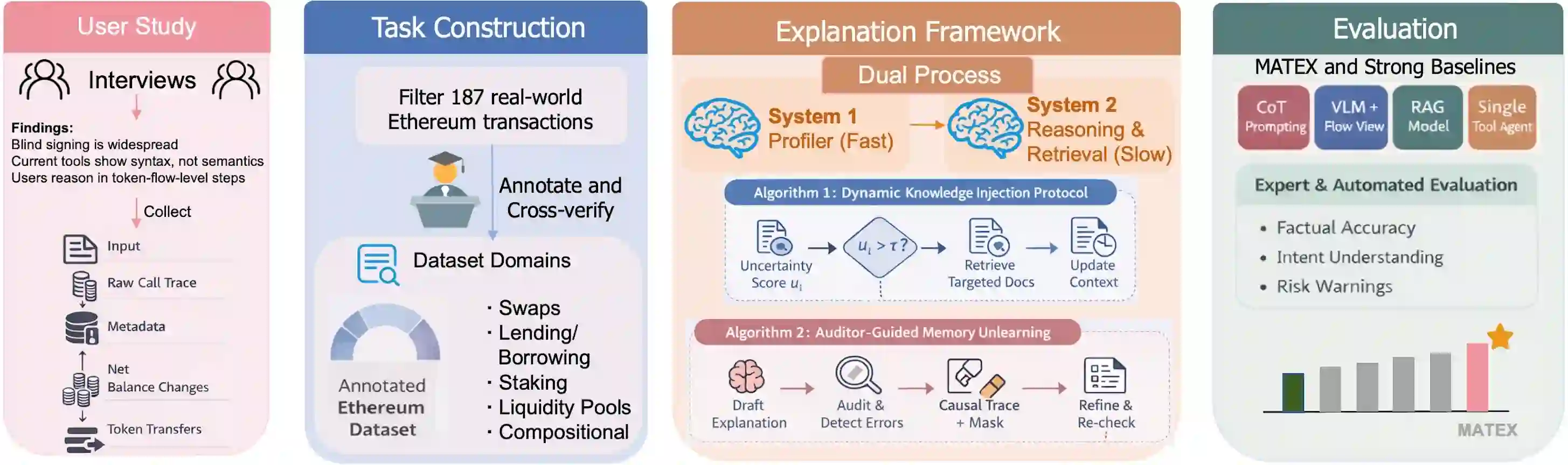 翻译:理解以太坊交易的经济意图对用户安全至关重要,然而现有工具仅能提供原始链上数据或表层意图信息,导致普遍的"盲签"现象(在不理解交易内容的情况下予以批准)。通过对16名Web3用户的访谈,我们发现有效的解释应当具备结构化、风险感知能力,并锚定于代币流动层面。基于这些发现,我们提出了TxSum——一个面向以太坊交易理解的用户中心化新型NLP任务,并构建了包含187笔复杂以太坊交易的数据集,其中标注了交易级摘要与代币流动级语义标签。我们进一步提出MATEX,一个基于多智能体的锚定式高风险交易解释框架。该框架能在不确定性条件下选择性检索外部知识,并通过原始交易轨迹审计解释内容,从而提升代币流动层面的事实一致性。MATEX实现了最优的整体解释质量,尤其在微观层面事实准确性与意图质量方面表现突出。相较于最强基线模型,该框架将用户对复杂交易的理解率从52.9%提升至76.5%,并将恶意交易拒绝率从36.0%提高至88.0%,同时在良性交易上保持较低的错误拒绝率。