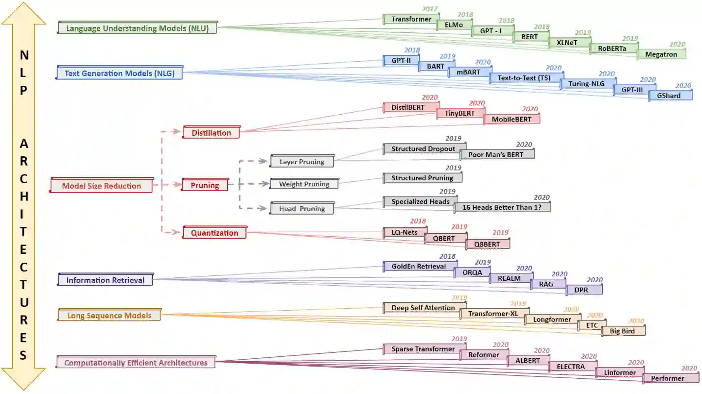 In recent years, Natural Language Processing (NLP) models have achieved phenomenal success in linguistic and semantic tasks like text classification, machine translation, cognitive dialogue systems, information retrieval via Natural Language Understanding (NLU), and Natural Language Generation (NLG). This feat is primarily attributed due to the seminal Transformer architecture, leading to designs such as BERT, GPT (I, II, III), etc. Although these large-size models have achieved unprecedented performances, they come at high computational costs. Consequently, some of the recent NLP architectures have utilized concepts of transfer learning, pruning, quantization, and knowledge distillation to achieve moderate model sizes while keeping nearly similar performances as achieved by their predecessors. Additionally, to mitigate the data size challenge raised by language models from a knowledge extraction perspective, Knowledge Retrievers have been built to extricate explicit data documents from a large corpus of databases with greater efficiency and accuracy. Recent research has also focused on superior inference by providing efficient attention to longer input sequences. In this paper, we summarize and examine the current state-of-the-art (SOTA) NLP models that have been employed for numerous NLP tasks for optimal performance and efficiency. We provide a detailed understanding and functioning of the different architectures, a taxonomy of NLP designs, comparative evaluations, and future directions in NLP.