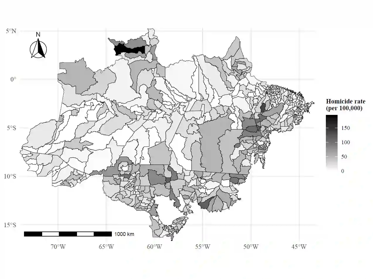 翻译:我们评估了环境执法对巴西亚马逊地区暴力事件的影响。实时森林砍伐检测系统(DETER)的引入,使政府能够实时监测森林砍伐并对非法砍伐行为处以罚款,显著降低了该地区的凶杀案发生率。为识别因果效应,我们利用云层覆盖产生的卫星监测外生变异作为执法强度的工具变量。我们的估计表明,通过DETER系统扩大国家存在每年预防了约1,477起凶杀案,相当于凶杀案减少了15%。这些结果表明,遏制森林砍伐能产生重要的社会协同效益,在制度脆弱和资源冲突突出的地区强化国家存在并减少暴力事件。