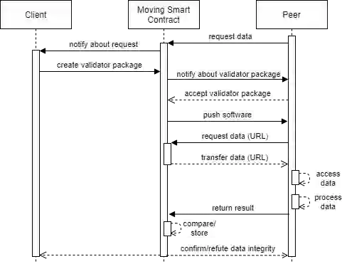 Blockchains provide environments where parties can interact transparently and securely peer-to-peer without needing a trusted third party. Parties can trust the integrity and correctness of transactions and the verifiable execution of binary code on the blockchain (smart contracts) inside the system. Including information from outside of the blockchain remains challenging. A challenge is data privacy. In a public system, shared data becomes public and, coming from a single source, often lacks credibility. A private system gives the parties control over their data and sources but trades in positive aspects as transparency. Often, not the data itself is the most critical information but the result of a computation performed on it. An example is research data certification. To keep data private but still prove data provenance, researchers can store a hash value of that data on the blockchain. This hash value is either calculated locally on private data without the chance for validation or is calculated on the blockchain, meaning that data must be published and stored on the blockchain -- a problem of the overall data amount stored on and distributed with the ledger. A system we called moving smart contracts bypasses this problem: Data remain local, but trusted nodes can access them and execute trusted smart contract code stored on the blockchain. This method avoids the system-wide distribution of research data and makes it accessible and verifiable with trusted software.