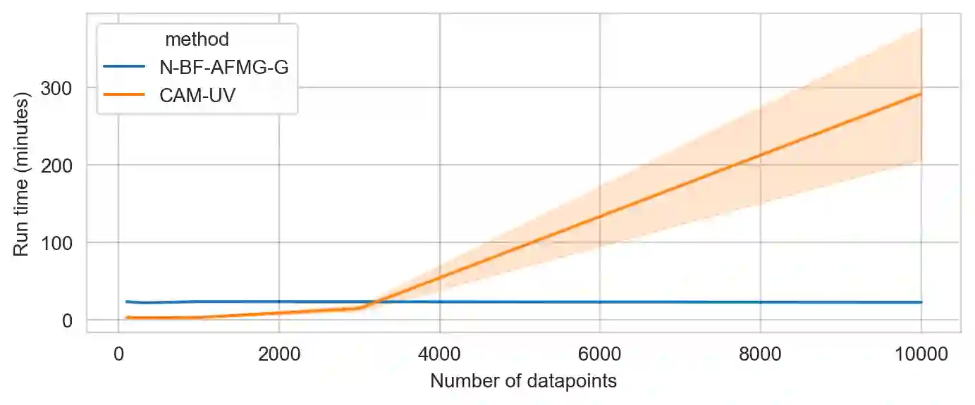 潜在混淆一直是从观察数据进行因果推理的长期障碍。一种流行的方法是使用无环有向混合图(ADMG),它使用定向和双向边描述变量之间的祖先关系。然而,现有的ADMG方法基于线性函数假设或者是复杂的离散搜索,对于大型数据集缺乏计算可处理性。在本研究中,我们进一步扩展现有的工作,从观察数据中开发一种基于非线性函数关系的ADMGS学习的新型基于梯度的方法。我们首先表明,在ADMGS的无弓形假定和非线性附加噪声模型的情况下,存在潜在混淆是可辨识的。基于此,我们提出了一种新的基于自回归流程的神经因果模型,用于ADMGS学习。这不仅可以使我们在存在潜在混淆的数据背后确定复杂的因果结构关系,同时还可以同时估计它们的函数关系(因此是治疗效果)。我们通过对合成数据和真实世界数据集的实验进一步验证了我们的方法,并展示了与相关基线的竞争性能。