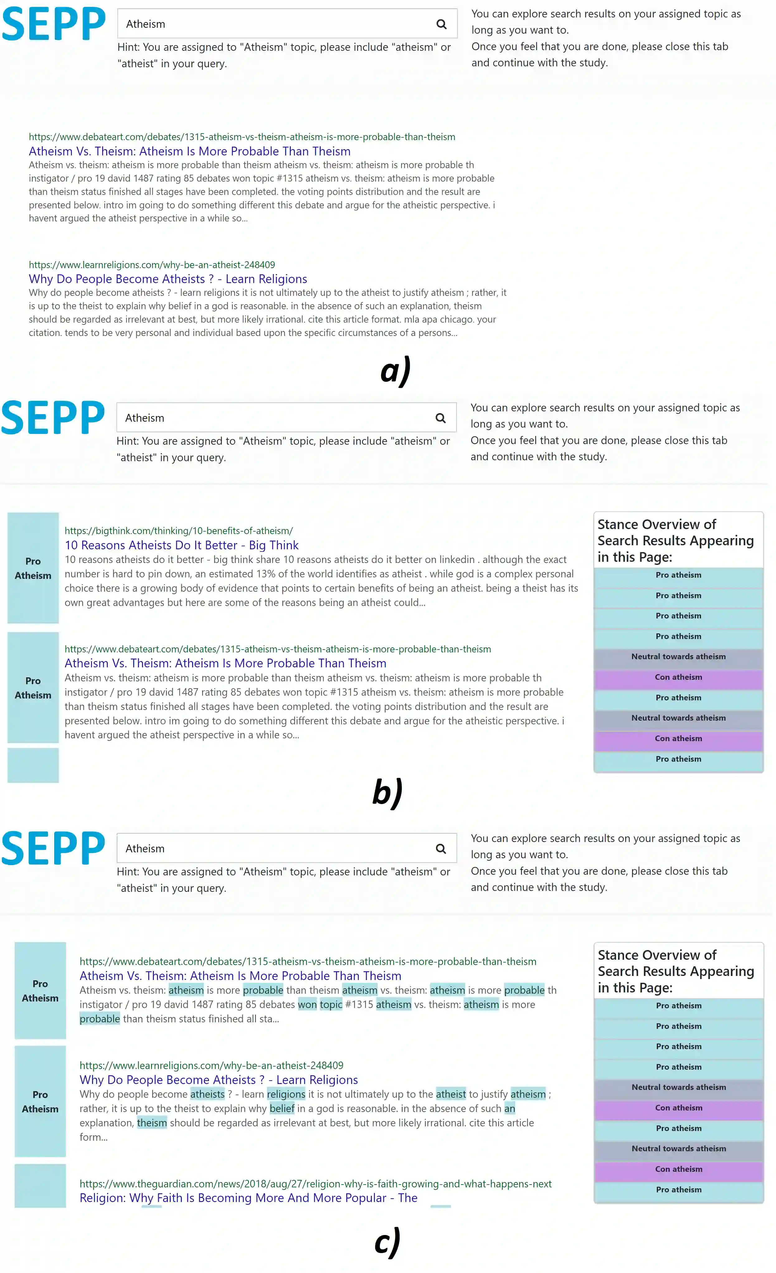 People use web search engines to find information before forming opinions, which can lead to practical decisions with different levels of impact. The cognitive effort of search can leave opinionated users vulnerable to cognitive biases, e.g., the confirmation bias. In this paper, we investigate whether stance labels and their explanations can help users consume more diverse search results. We automatically classify and label search results on three topics (i.e., intellectual property rights, school uniforms, and atheism) as against, neutral, and in favor, and generate explanations for these labels. In a user study (N =203), we then investigate whether search result stance bias (balanced vs biased) and the level of explanation (plain text, label only, label and explanation) influence the diversity of search results clicked. We find that stance labels and explanations lead to a more diverse search result consumption. However, we do not find evidence for systematic opinion change among users in this context. We believe these results can help designers of search engines to make more informed design decisions.
