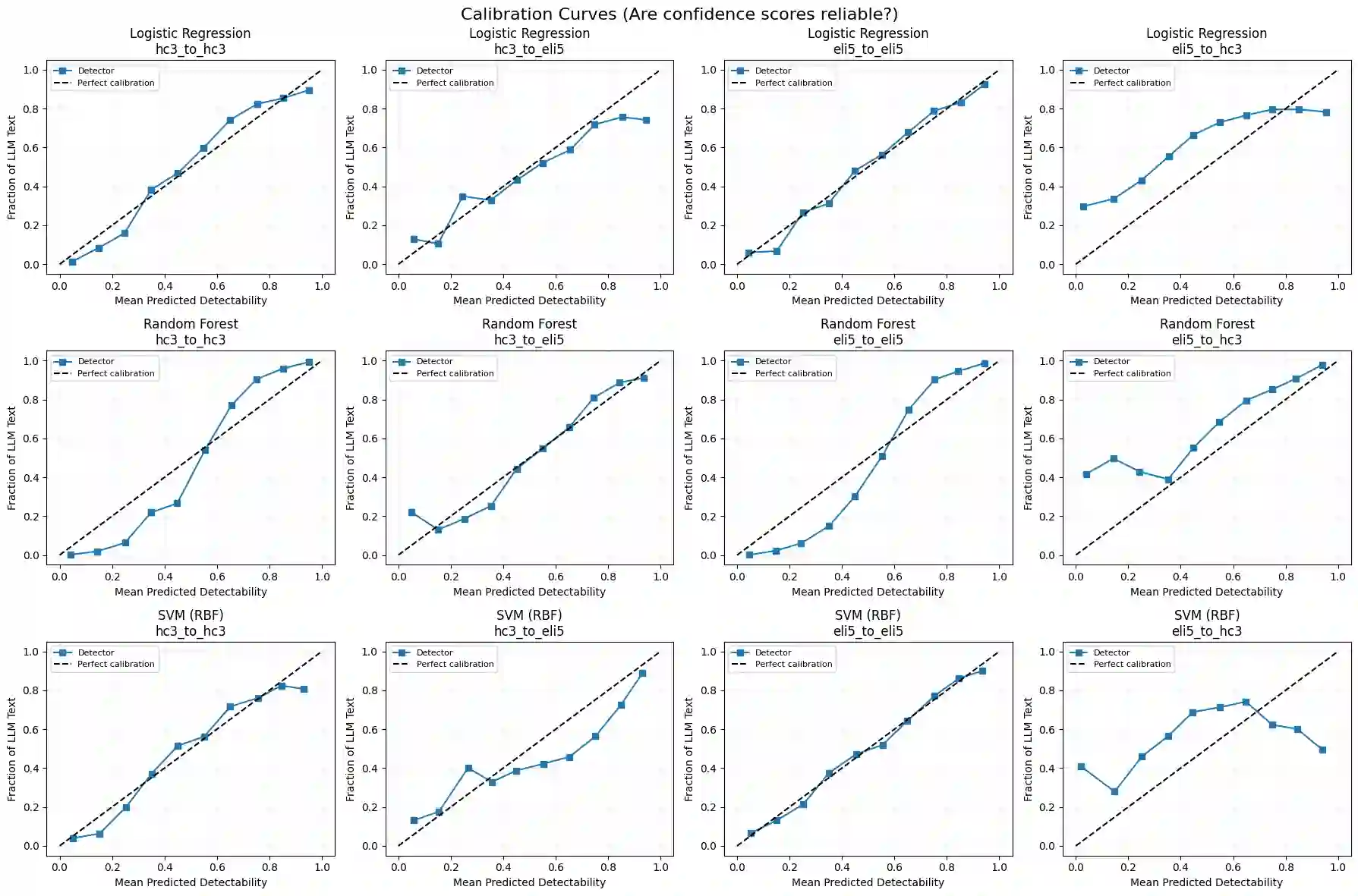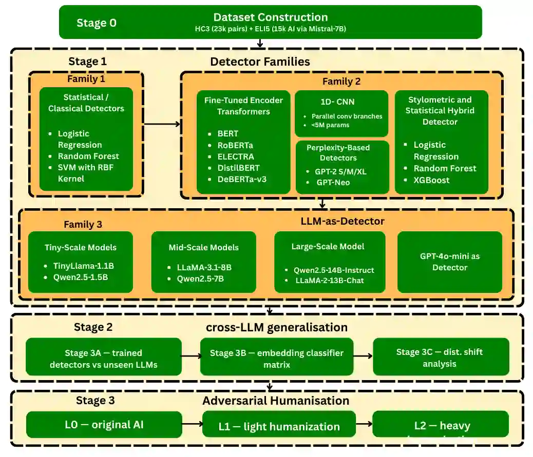 翻译:大型语言模型(LLM)的快速扩散催生了对鲁棒且可泛化的机器生成文本检测器的迫切需求。现有基准通常仅在理想条件下针对单一数据集评估单一检测器,未能解决跨领域迁移、跨LLM泛化及对抗鲁棒性等关键问题。本文提出一个综合基准,在两个语料库上评估多种检测方法:HC3(23,363个人类-ChatGPT对话对)和ELI5(15,000个人类-Mistral-7B对话对)。评估方法涵盖经典分类器、微调Transformer编码器(BERT、RoBERTa、ELECTRA、DistilBERT、DeBERTa-v3)、CNN、XGBoost风格计量模型、基于困惑度的检测器以及LLM作为检测器的提示方法。实验结果表明:Transformer模型在分布内数据上达到接近完美的性能,但在领域偏移下显著退化;XGBoost风格计量模型在保持可解释性的同时达到相当性能;基于LLM的检测器表现欠佳且受生成器-检测器身份偏差影响;基于困惑度的方法出现极性反转现象(现代LLM输出文本的困惑度低于人类文本),但经校正后仍保持有效性。所有方法均未能在跨领域和跨LLM场景中实现鲁棒泛化。