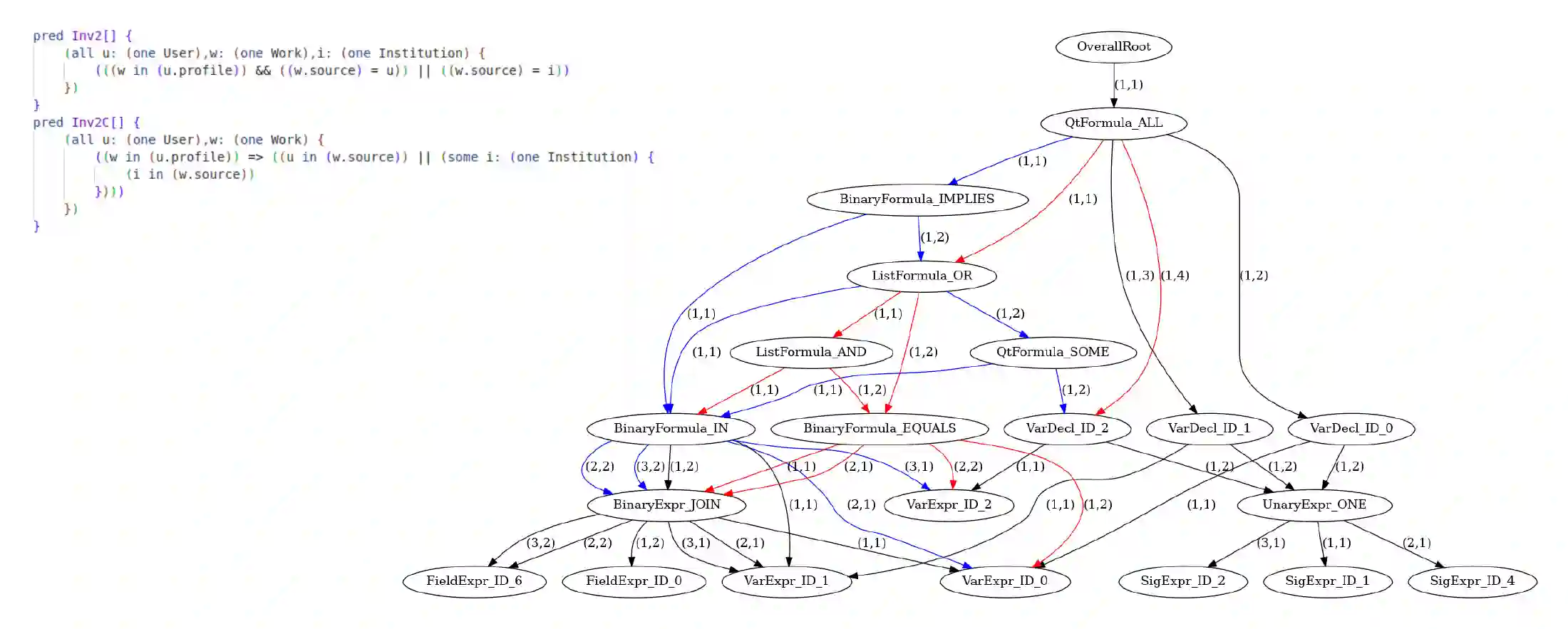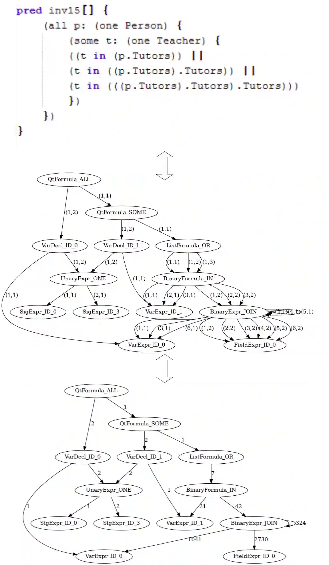 In the program analysis and automated bug-fixing fields, it is common to create an abstract interpretation of a program's source code as an Abstract Syntax Tree (AST), which enables programs written in a high-level language to have various static and dynamic analyses applied. However, ASTs suffer from exponential growth in their data size due to the limitation that ASTs will often have identical nodes separately listed in the tree. To address this issue, we introduce a novel code representation schema, Complex Structurally Balanced Abstract Semantic Graph (CSBASG), which represents code as a complex-weighted directed graph that lists a semantic element as a node in the graph and ensures its structural balance for almost finitely enumerable code segments, such as the modeling language Alloy. Our experiment ensures that CSBASG provides a one-on-one correspondence of Alloy predicates to complex-weighted graphs. We evaluate the effectiveness and efficiency of our CSBASG representation for Alloy models and identify future applications of CSBASG for Alloy code generation and automated repair.