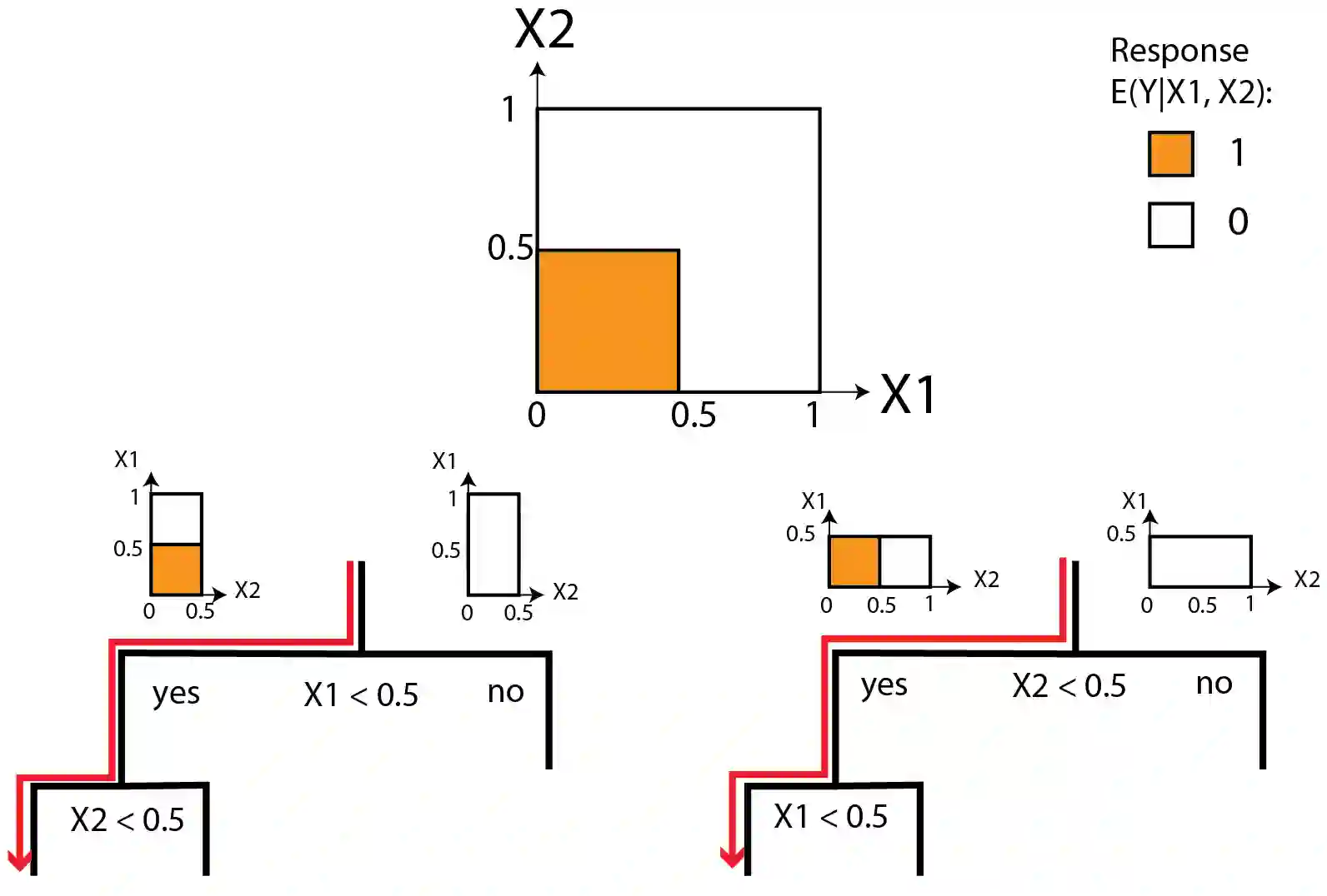 Random Forests (RF) are at the cutting edge of supervised machine learning in terms of prediction performance, especially in genomics. Iterative Random Forests (iRF) use a tree ensemble from iteratively modified RF to obtain predictive and stable non-linear high-order Boolean interactions of features. They have shown great promise for high-order biological interaction discovery that is central to advancing functional genomics and precision medicine. However, theoretical studies into how tree-based methods discover high-order feature interactions are missing. In this paper, to enable such theoretical studies, we first introduce a novel discontinuous nonlinear regression model, called Locally Spiky Sparse (LSS) model, which is inspired by the thresholding behavior in many biological processes. Specifically, LSS model assumes that the regression function is a linear combination of piece-wise constant Boolean interaction terms. We define a quantity called depth-weighted prevalence (DWP) for a set of signed features S and a given RF tree ensemble. We prove that, with high probability under the LSS model, DWP of S attains a universal upper bound that does not involve any model coefficients, if and only if S corresponds to a union of Boolean interactions in the LSS model. As a consequence, we show that RF yields consistent interaction discovery under the LSS model. Simulation results show that DWP can recover the interactions under the LSS model even when some assumptions such as the uniformity assumption are violated.