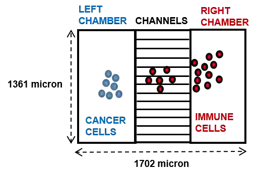This study is a first step towards using data-informed differential models to predict and control the dynamics of cancer-on-chip experiments. We consider a conceptualized one-dimensional device, containing a cancer and a population of white blood cells. The interaction between the cancer and the population of cells is modeled by a chemotaxis model inspired by Keller-Segel-type equations, which is solved by a Hybridized Discontinuous Galerkin method. Our goal is using (synthetic) data to tune the parameters of the governing equations and to assess the uncertainty on the predictions of the dynamics due to the residual uncertainty on the parameters remaining after the tuning procedure. To this end, we apply techniques from uncertainty quantification for parametric differential models. We first perform a global sensitivity analysis using both Sobol and Morris indices to assess how parameter uncertainty impacts model predictions, and fix the value of parameters with negligible impact. Subsequently, we conduct an inverse uncertainty quantification analysis by Bayesian techniques to compute a data-informed probability distribution of the remaining model parameters. Finally, we carry out a forward uncertainty quantification analysis to compute the impact of the updated (residual) parametric uncertainties on the quantities of interest of the model. The whole procedure is sped up by using surrogate models, based on sparse-grids, to approximate the mapping of the uncertain parameters to the quantities of interest.