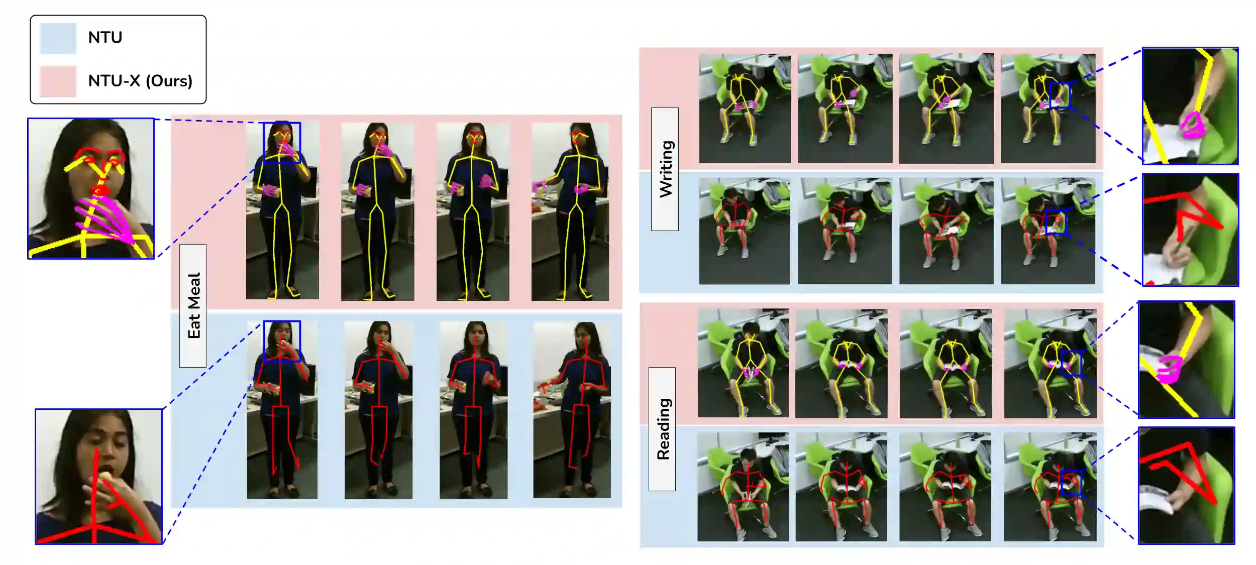 The lack of fine-grained joints such as hand fingers is a fundamental performance bottleneck for state of the art skeleton action recognition models trained on the largest action recognition dataset, NTU-RGBD. To address this bottleneck, we introduce a new skeleton based human action dataset - NTU60-X. In addition to the 25 body joints for each skeleton as in NTU-RGBD, NTU60-X dataset includes finger and facial joints, enabling a richer skeleton representation. We appropriately modify the state of the art approaches to enable training using the introduced dataset. Our results demonstrate the effectiveness of NTU60-X in overcoming the aforementioned bottleneck and improve state of the art performance, overall and on hitherto worst performing action categories.
