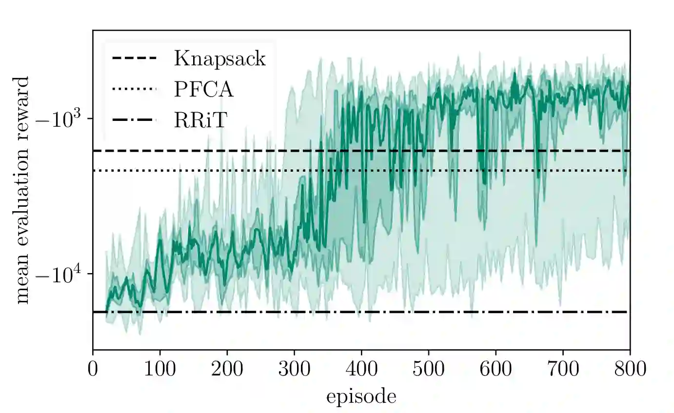 翻译:随着无线网络中各种数据率和延迟要求的用户设备数量增加,正方频率多访问(OFDMA)的资源分配问题变得具有挑战性,特别是,不同要求导致在最大使用系统数据率时出现非conex优化问题,同时保持UES之间的公平性。在本文件中,我们通过深层强化学习(DRL)解决非convex优化问题。我们计划、训练和评价一个DRL代理,该代理为DMA的下链接执行媒体访问控制时间表安排任务。为了启动对我们的代理的培训,我们引入模拟学习。为了改进时间安排性能,将基础站的全部缓冲状态信息(例如包龄、包体大小)考虑在内。像输入特性压缩、包体打和年龄上限等技术进一步提高了代理的性能。我们用Nokia的无线套装来培训和评估我们的代理,并对照不同的基准代理进行评估。我们显示,我们的代理明显超越基准代理。