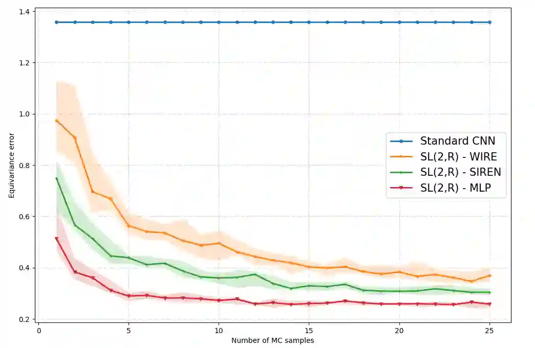 Invariance and equivariance to geometrical transformations have proven to be very useful inductive biases when training (convolutional) neural network models, especially in the low-data regime. Much work has focused on the case where the symmetry group employed is compact or abelian, or both. Recent work has explored enlarging the class of transformations used to the case of Lie groups, principally through the use of their Lie algebra, as well as the group exponential and logarithm maps. The applicability of such methods is limited by the fact that depending on the group of interest $G$, the exponential map may not be surjective. Further limitations are encountered when $G$ is neither compact nor abelian. Using the structure and geometry of Lie groups and their homogeneous spaces, we present a framework by which it is possible to work with such groups primarily focusing on the groups $G = \text{GL}^{+}(n, \mathbb{R})$ and $G = \text{SL}(n, \mathbb{R})$, as well as their representation as affine transformations $\mathbb{R}^{n} \rtimes G$. Invariant integration as well as a global parametrization is realized by a decomposition into subgroups and submanifolds which can be handled individually. Under this framework, we show how convolution kernels can be parametrized to build models equivariant with respect to affine transformations. We evaluate the robustness and out-of-distribution generalisation capability of our model on the benchmark affine-invariant classification task, outperforming previous proposals.